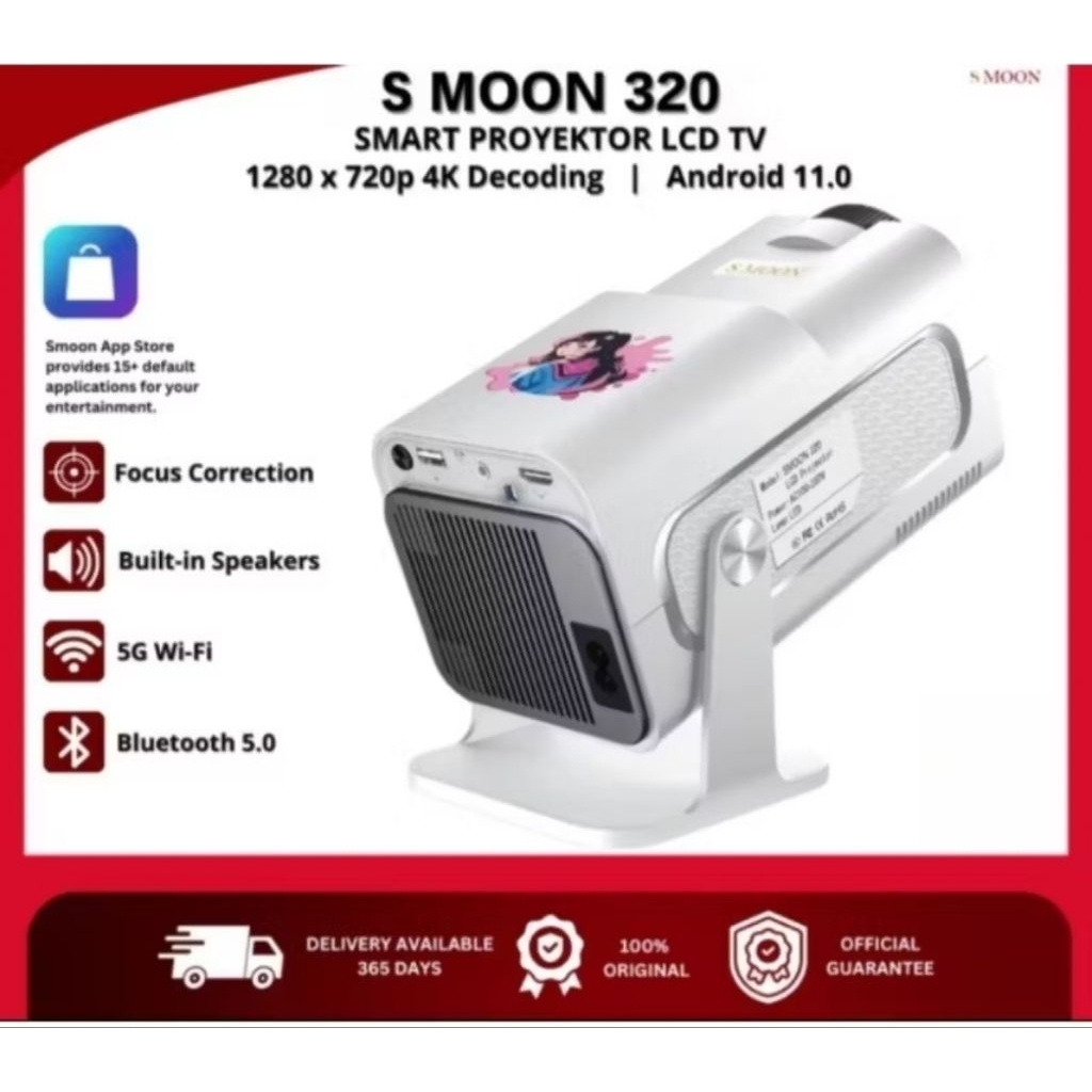 S Moon 320 Proyektor Smart Android LCD TV dengan Resolusi 1280x720p, Sistem Android 11.0, Koneksi Wi-Fi & Bluetooth 5.0