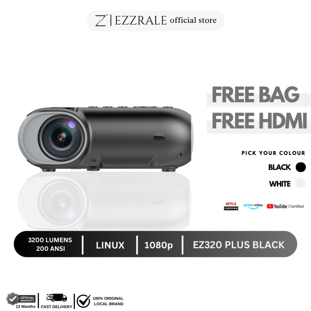 EZZRALE EZ320+ (Plus) 3200 Lumens ( 200 ANSI ) Smart Projector LINUX Netflix Verified