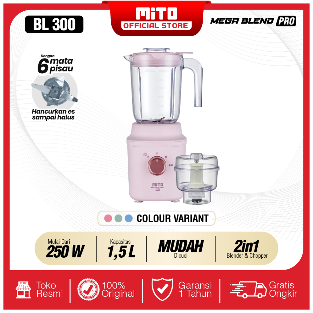 MITO MEGA BLEND PRO BL300 - 1,5L Jar 2 Tingkat Kecepatan + Pulse + 6 Mata Pisau dengan Ice Crusher