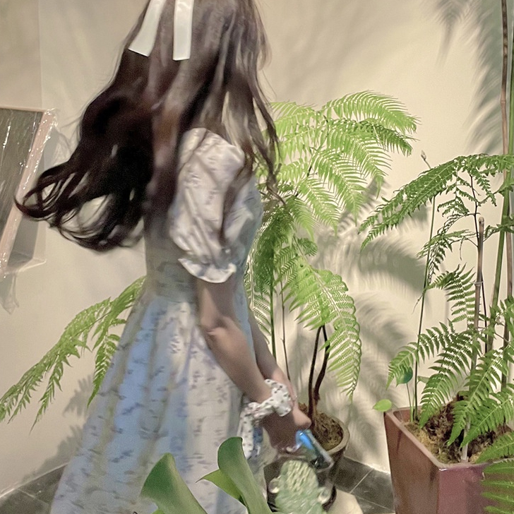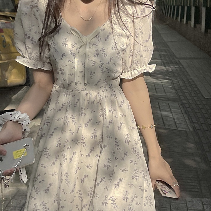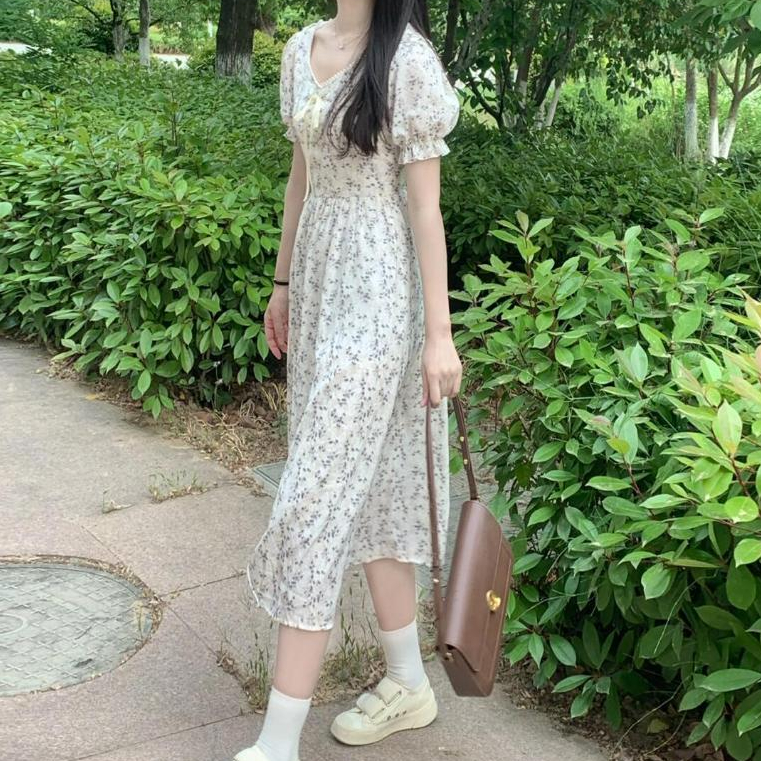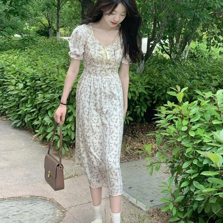 Nico#[Ready] Midi dress korea/Gaun Bunga Krim Wanita Musim Panas Lembut Prancis Lengan Gelembung Rok Sifon Rok Cinta Per