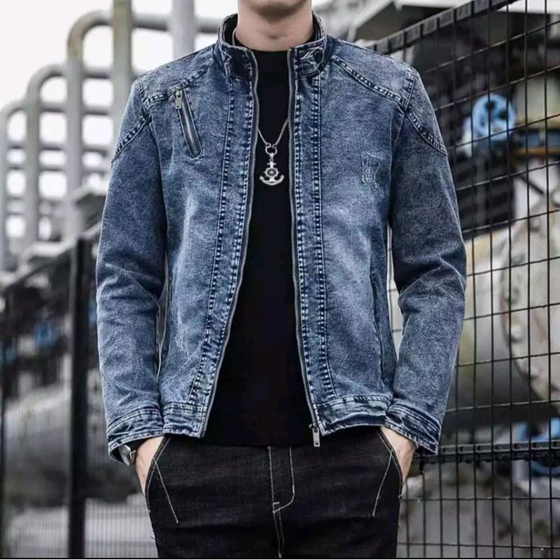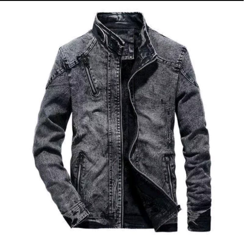 TERLARIS JAKET JEANS PRIA DENIM TEBAL POLOS BIKER KERAH TINGGI ATASAN TERLARIS FASHION KEKINIAN