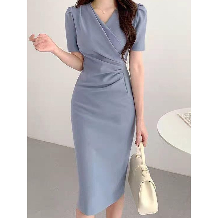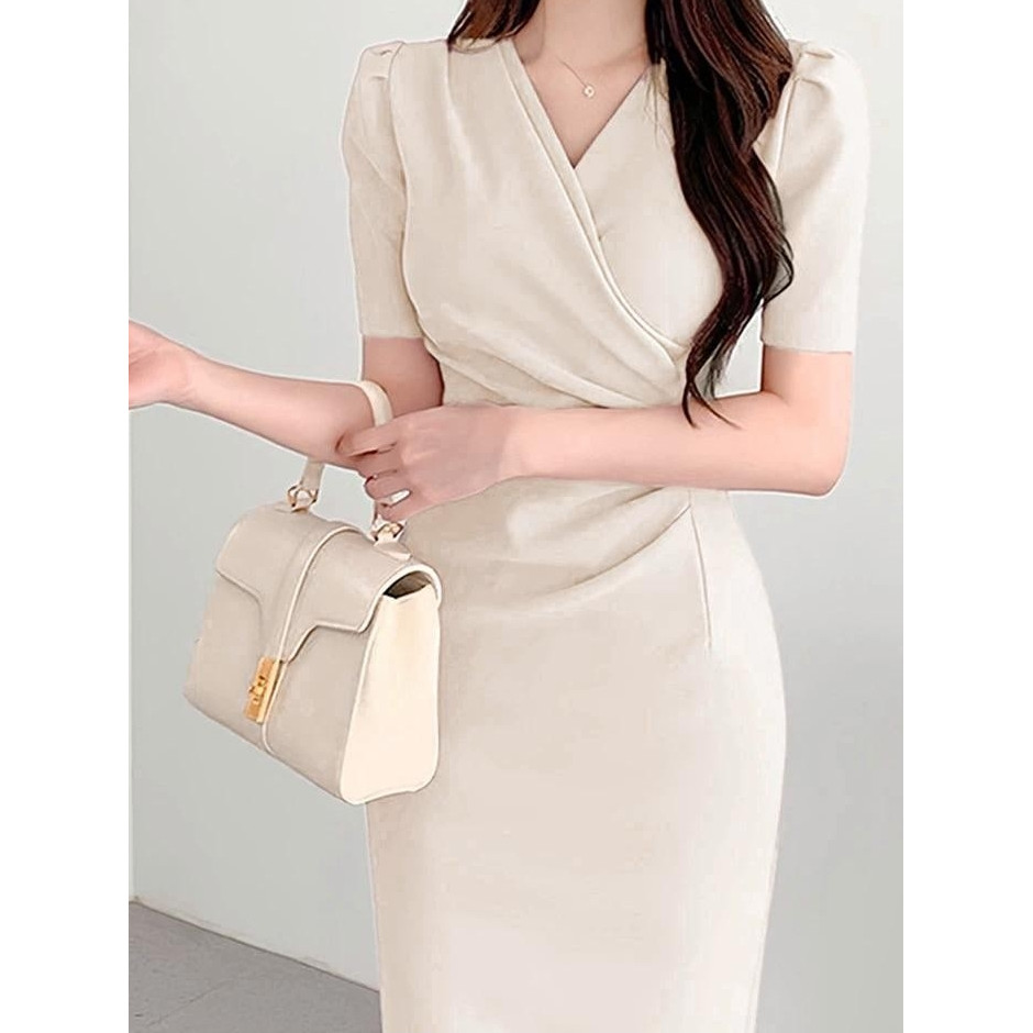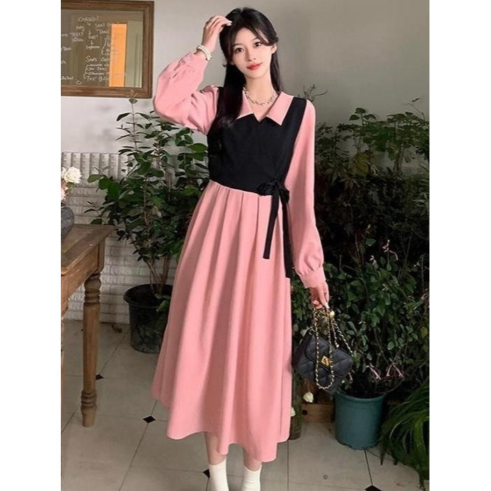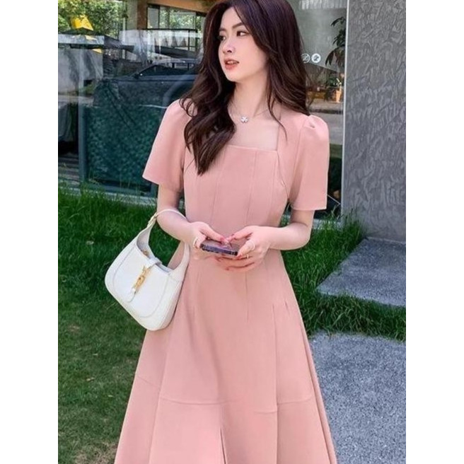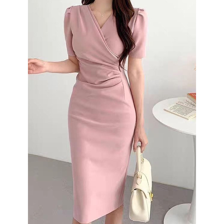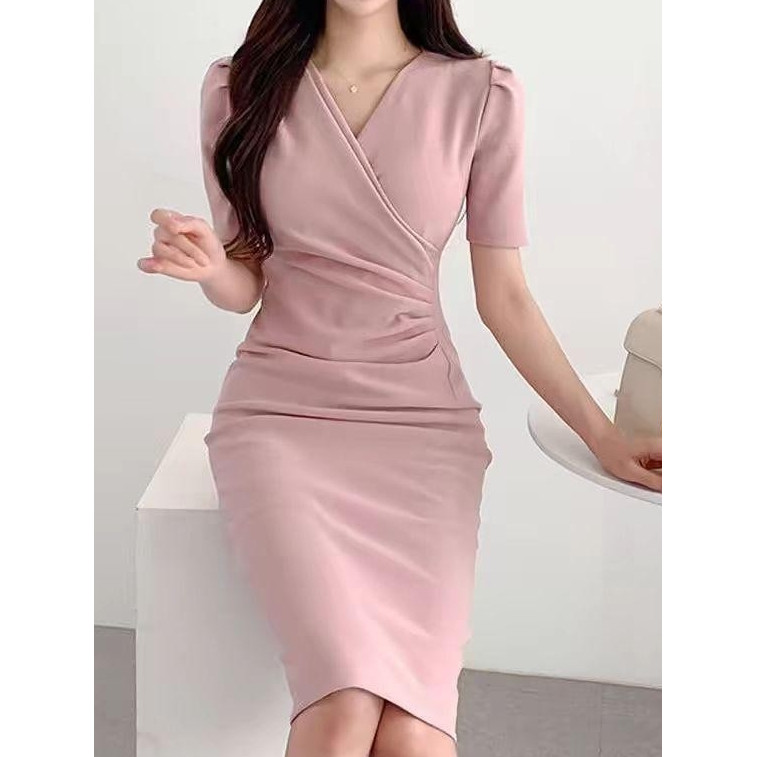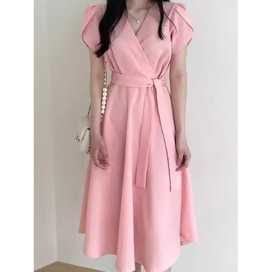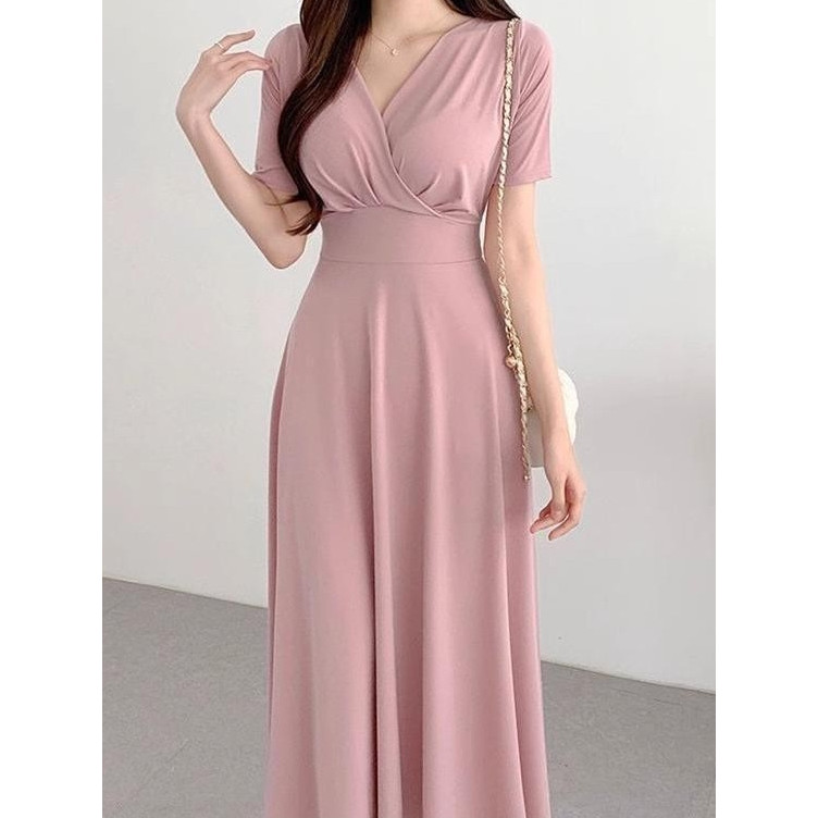 YIMITA dress pink soft korean style elegan mewah dan simple long dress formal elegant midi dress santai wanita casual dr