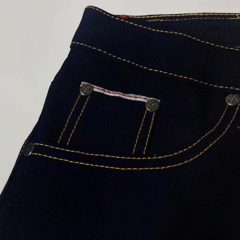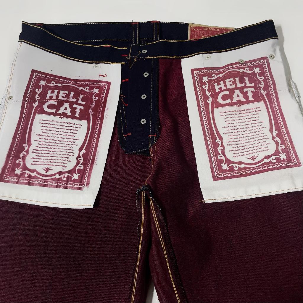 TERLARIS CELANA DENIM SELVEDGE 15 OZ ART HEELCAT SANFORIZED WEFT X MAROON ACCENT SELVEDGE WEFT MERAH RAW DENIM KAKU INDI