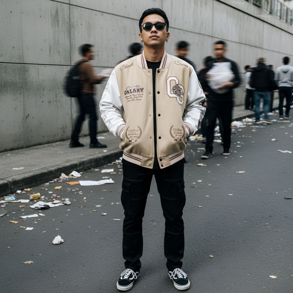 TERLARIS VARSITY JACKET COSMIC GALAXY CREAM WHITE | JAKET BASEBALL BORDIR ORI BLACKSEVEN | MILLENIAL STUDIO