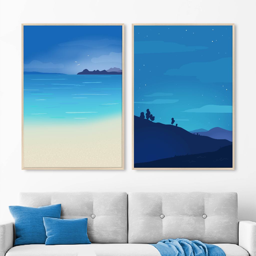 Hiasan Dinding Ruang Tamu Minimalis 80x57cm & 40x57cm INCLUDE FRAME - BEACH BLUE WAVE DESIGN - Wall Decor Ruang Tamu Kam