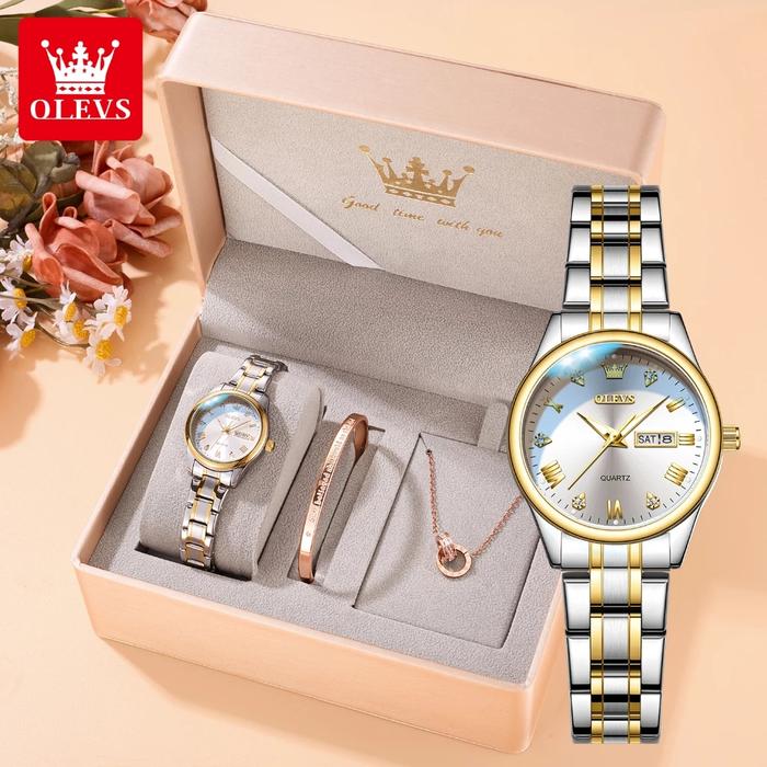 OLEVS Jam Tangan Wanita Anti Air Original Rantai Anti Karat Mewah Set Kalung Gelang Bercahaya