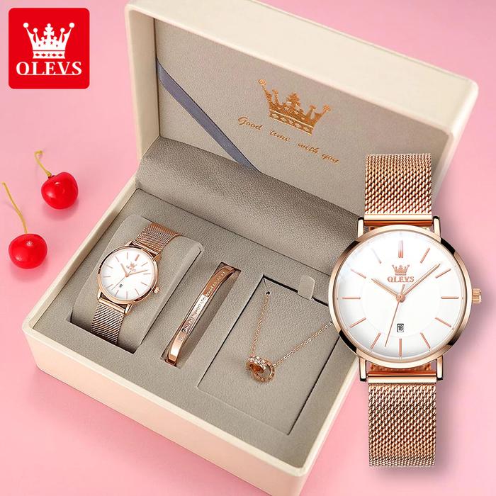OLEVS Jam Tangan Wanita Set Kalung Gelang Original Asli Untuk Tahan Air Rose Gold Lady Girl Watch