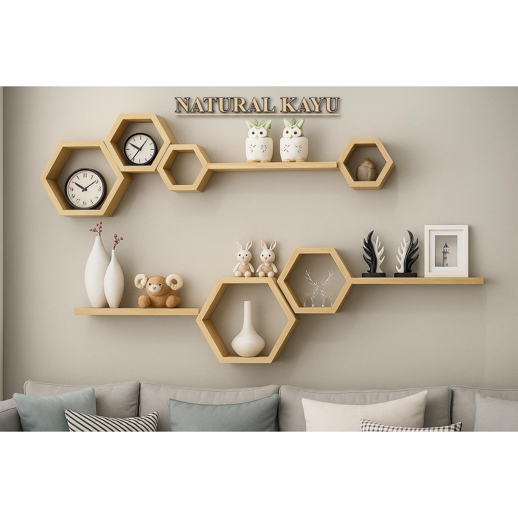 Rak hexagonal dinding hexagonal 1set ambalan hiasan dinding rak hexagonal estetik kayu pajangan kayu