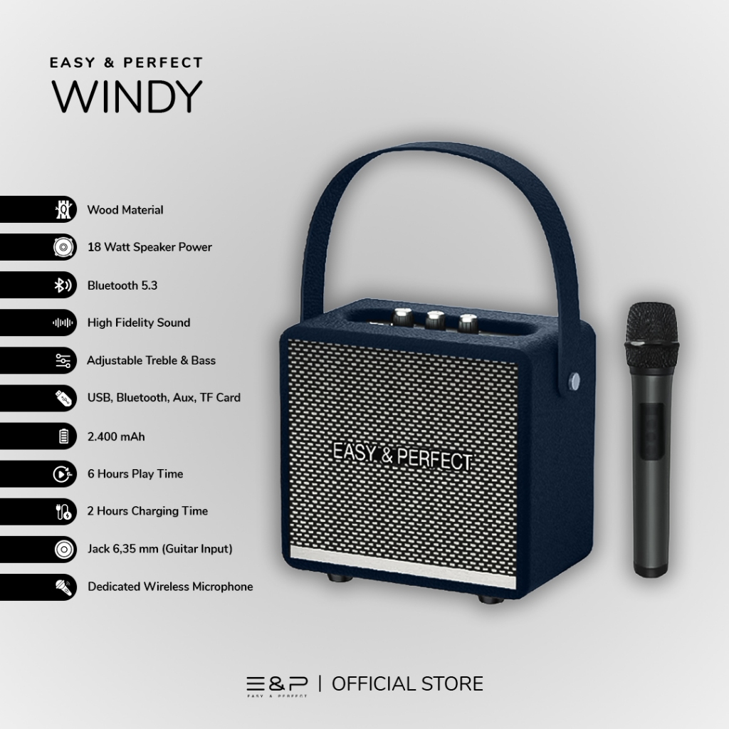 Easy & Perfect Windy - 18 Watt Speaker Power with Adjustable Treble, Bass, Jack 6.5 mm Guitar Input and Wireless Microphone