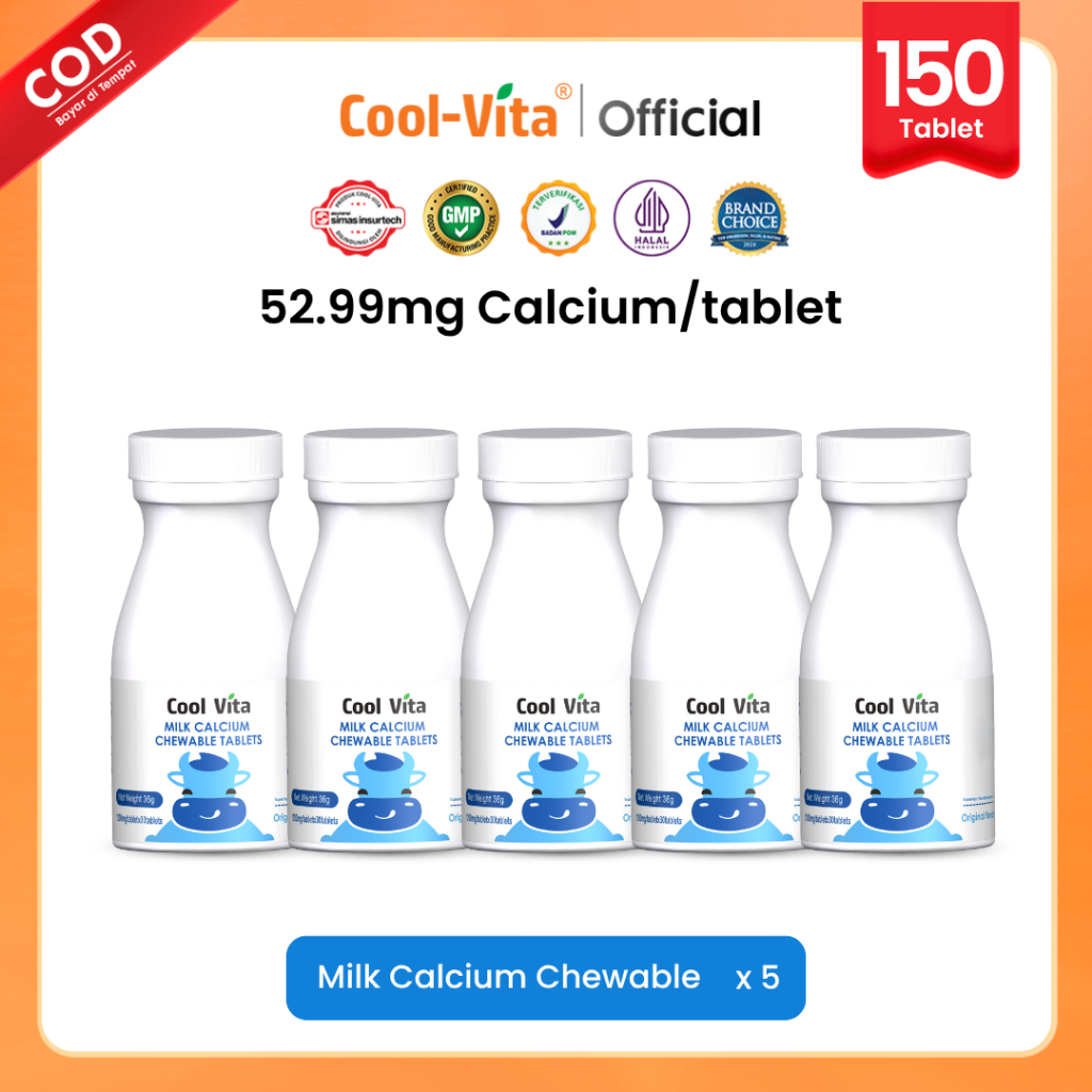 Coolvita Milk Calcium Chewable Tablets Original Flavor 5 Botol Isi 150 Tablet - Suplemen Kesehatan Tablet Kunyah Kalsium
