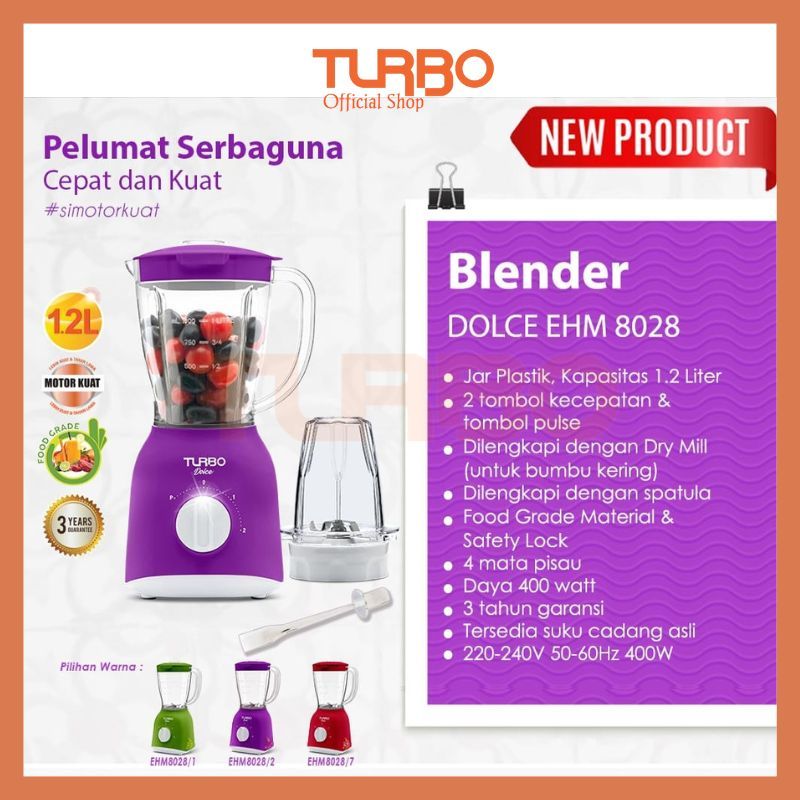 [RED] Turbo New Dolce Plastic Blender / Blender Plastik Turbo Ukuran 1.2 Liter EHM8028 - 3 Pilihan Warna 400 Watt Garans