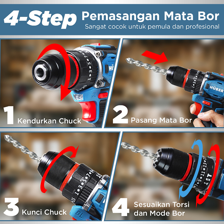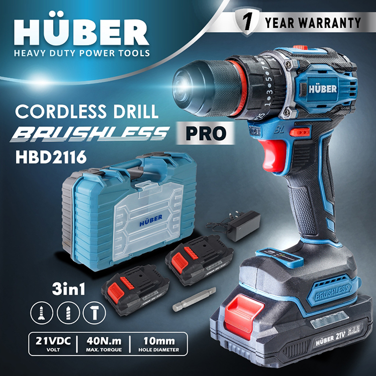 HUBER HBD2116 Pro Brushless Cordless Drill Impact Function 21V Bor Tembok Beton Kayu Besi Sekrup