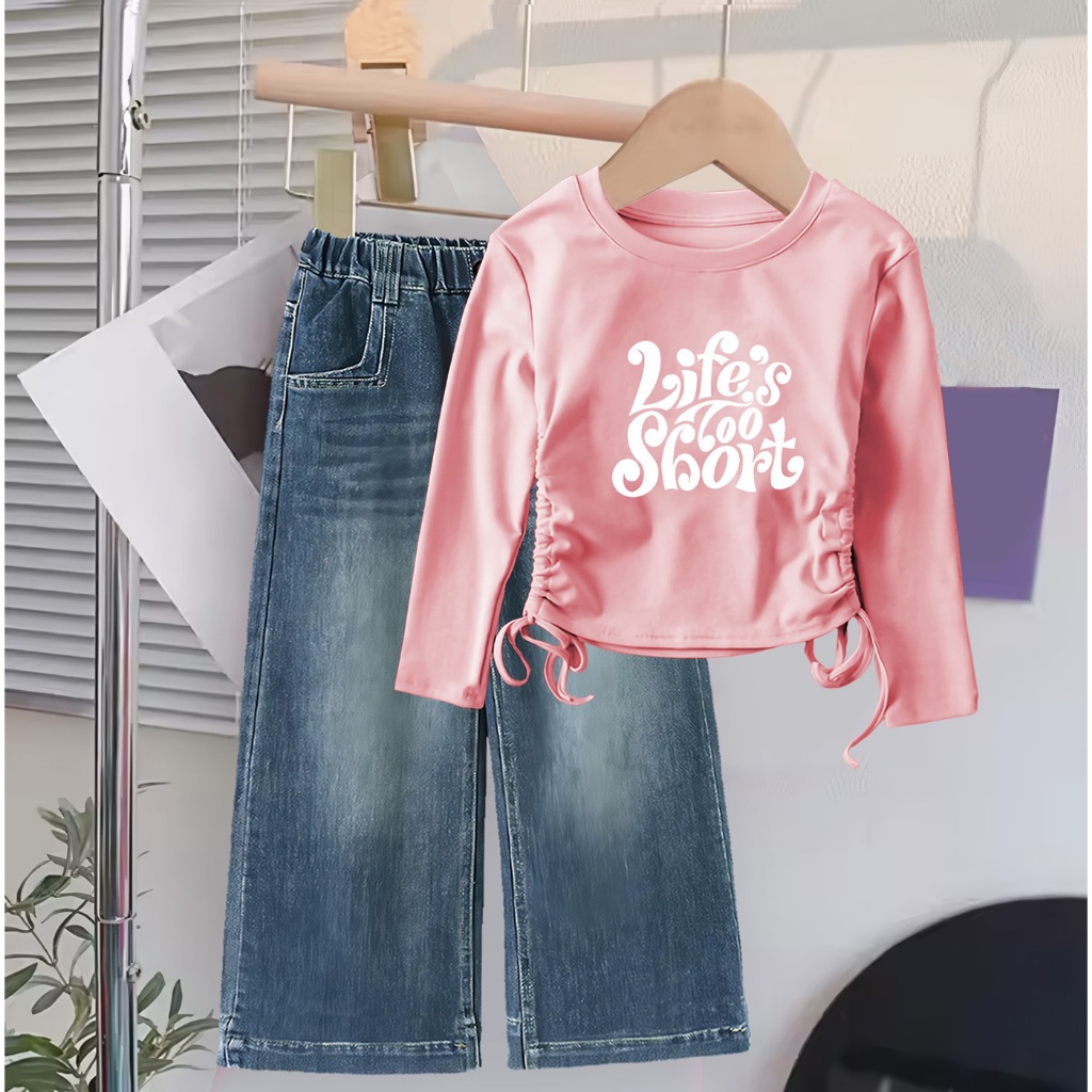 Setelan Baju Crop Panjang Celana Jeans Anak Cewek Usia 1 2 3 4 5 6 7 8 9 10 11 12 Tahun