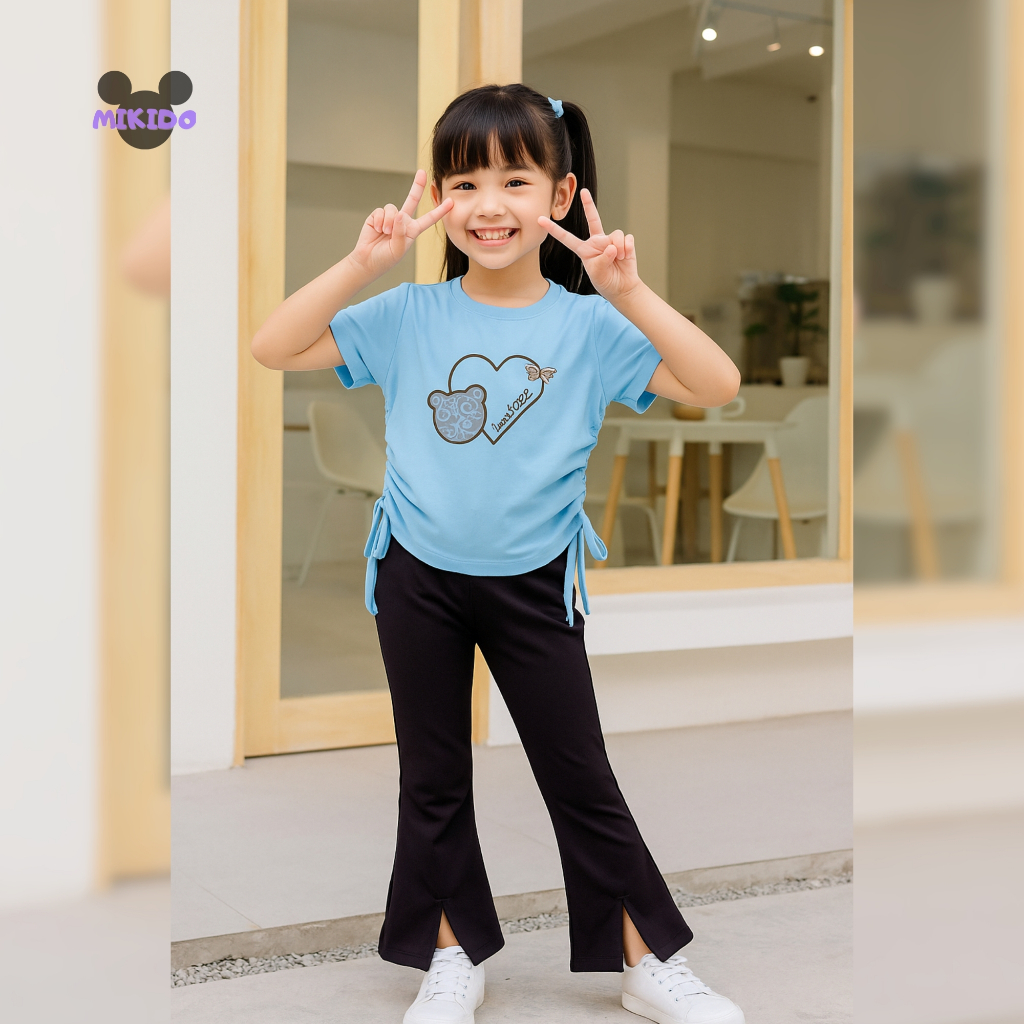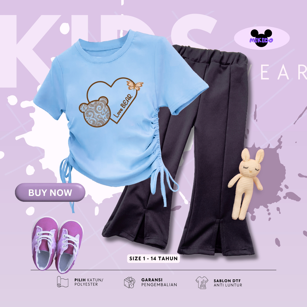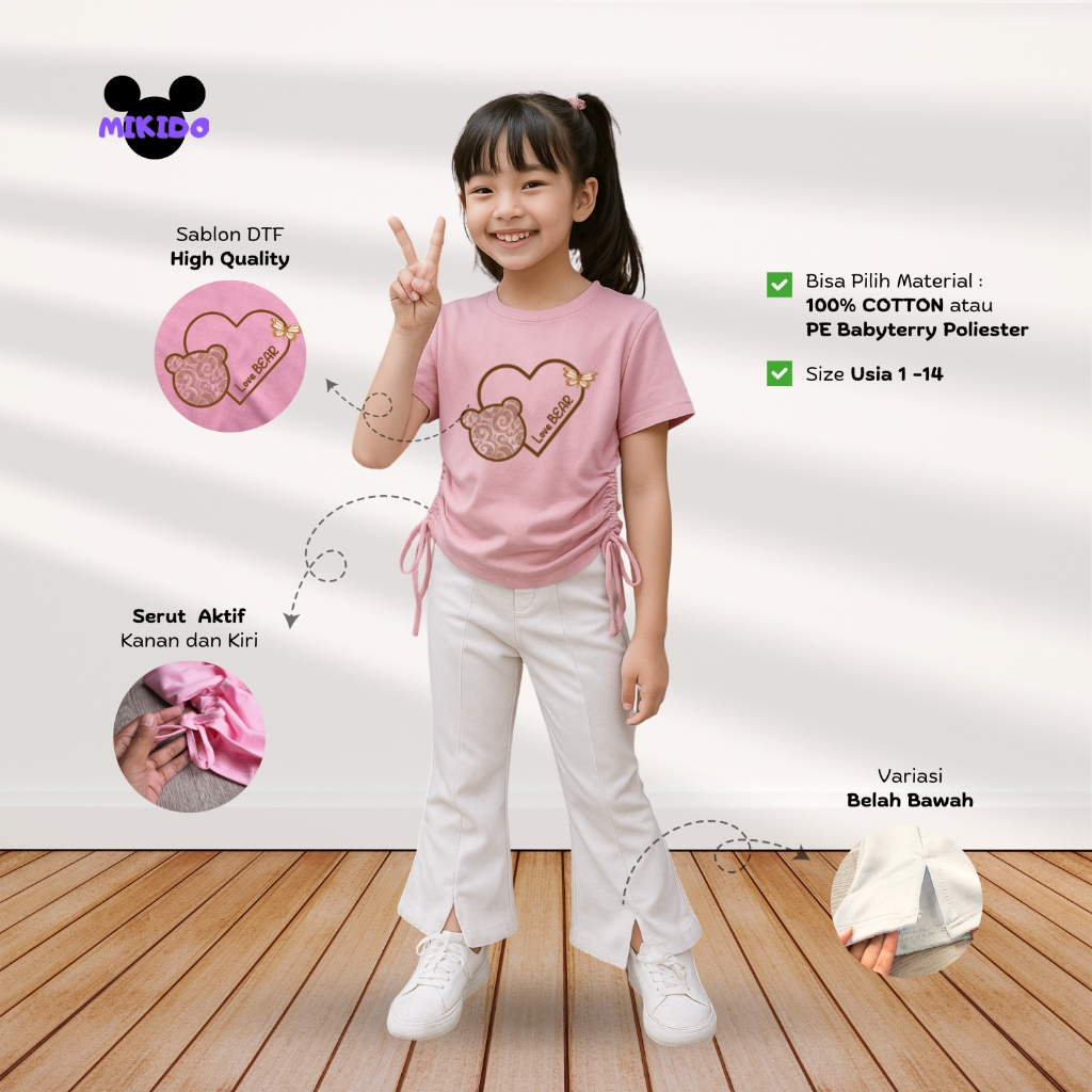 Setelan Kaos Serut Crop Top dan Cutbray Belah Anak Perempuan Love Bear Umur 1-14 tahun Part 1