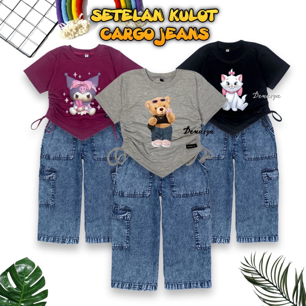 SETELAN ANAK PEREMPUAN KEKINIAN / ONE SET KULOT CARG0 JEANS / KAOS SERUT SABLON USIA 2-12 TAHUN