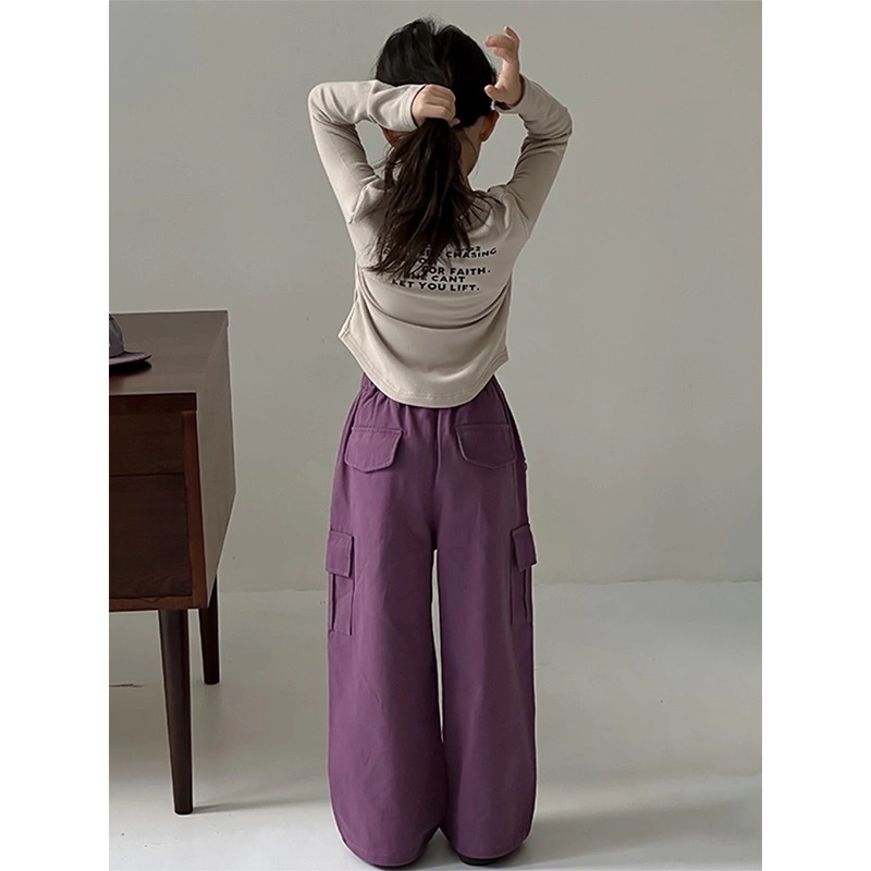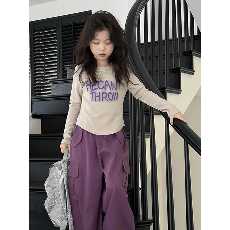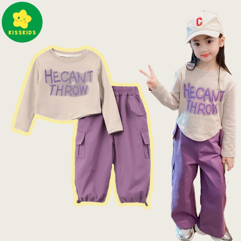 KissKids Korea Style Setelan Anak Perempuan Cargo Atasan Lengan Panjang+Celana Panjang Warna Ungu OOTD anak cewek