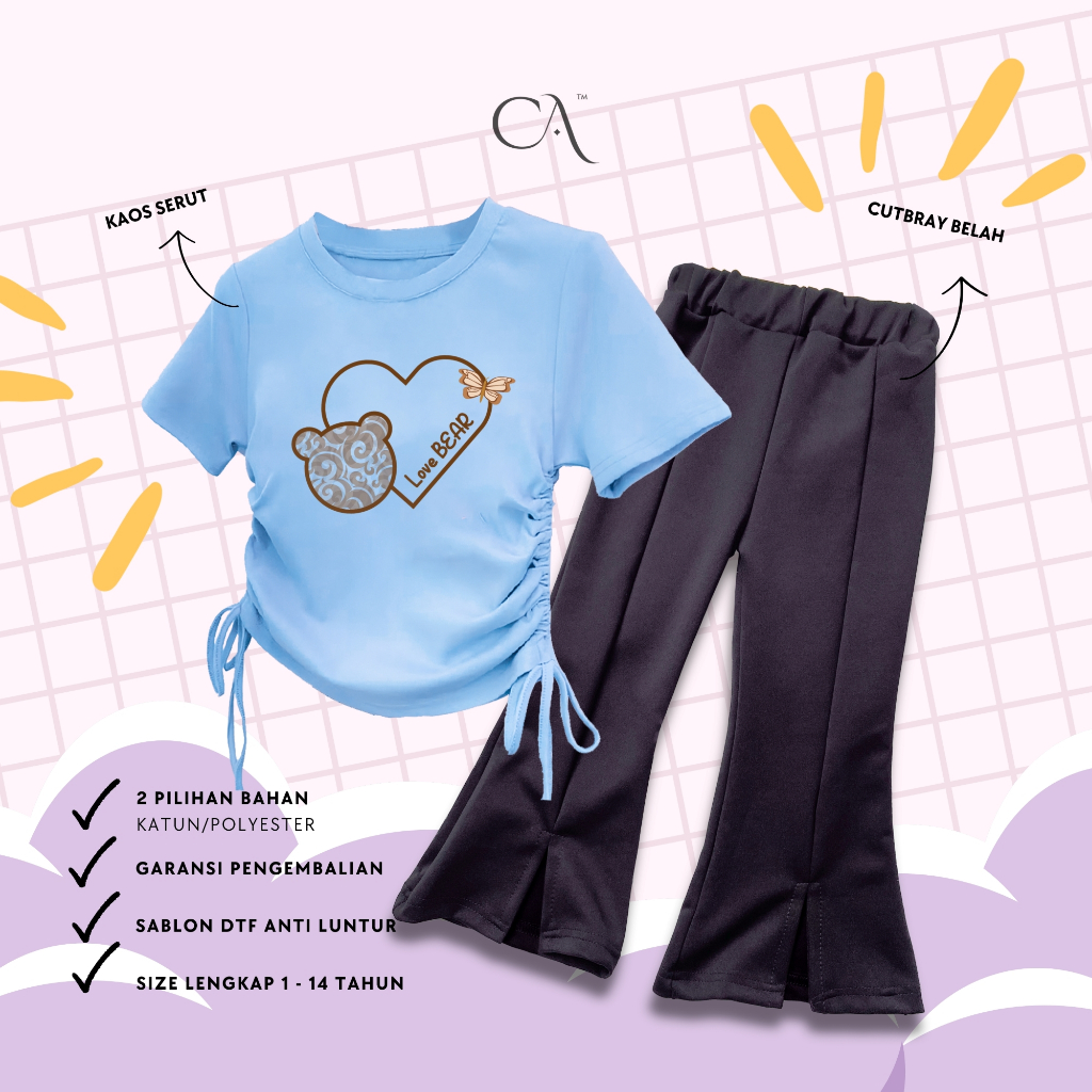 Setelan Kaos Serut Crop Top dan Cutbray Belah Anak Perempuan Love Bear Umur 1-14 tahun Part 1