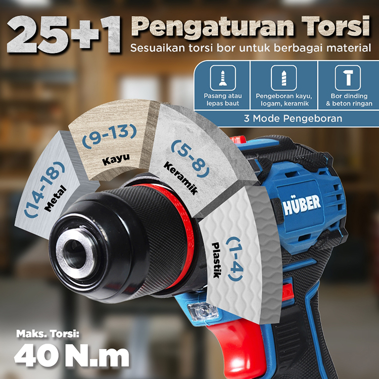 Huber Bor Tangan Listrik Brushless Cordless Drill Bor Portable Tanpa Kabel Bor Tembok Beton Kayu