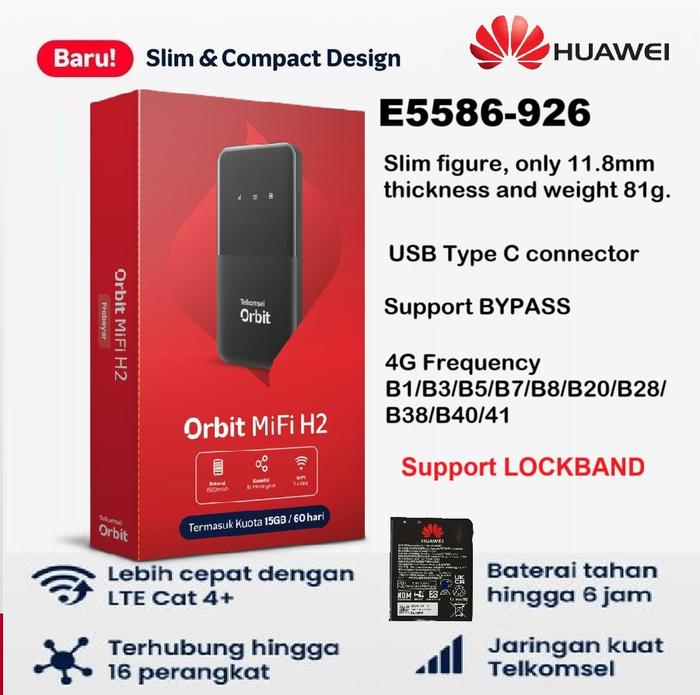 Huawei E5586-926 Orbit Mifi H2 Mifi Router Modem Wifi 4G Lte Cat 4 Bypass Free Tsel 25Gb Garansi Resmi Unicom - E5586 Ta