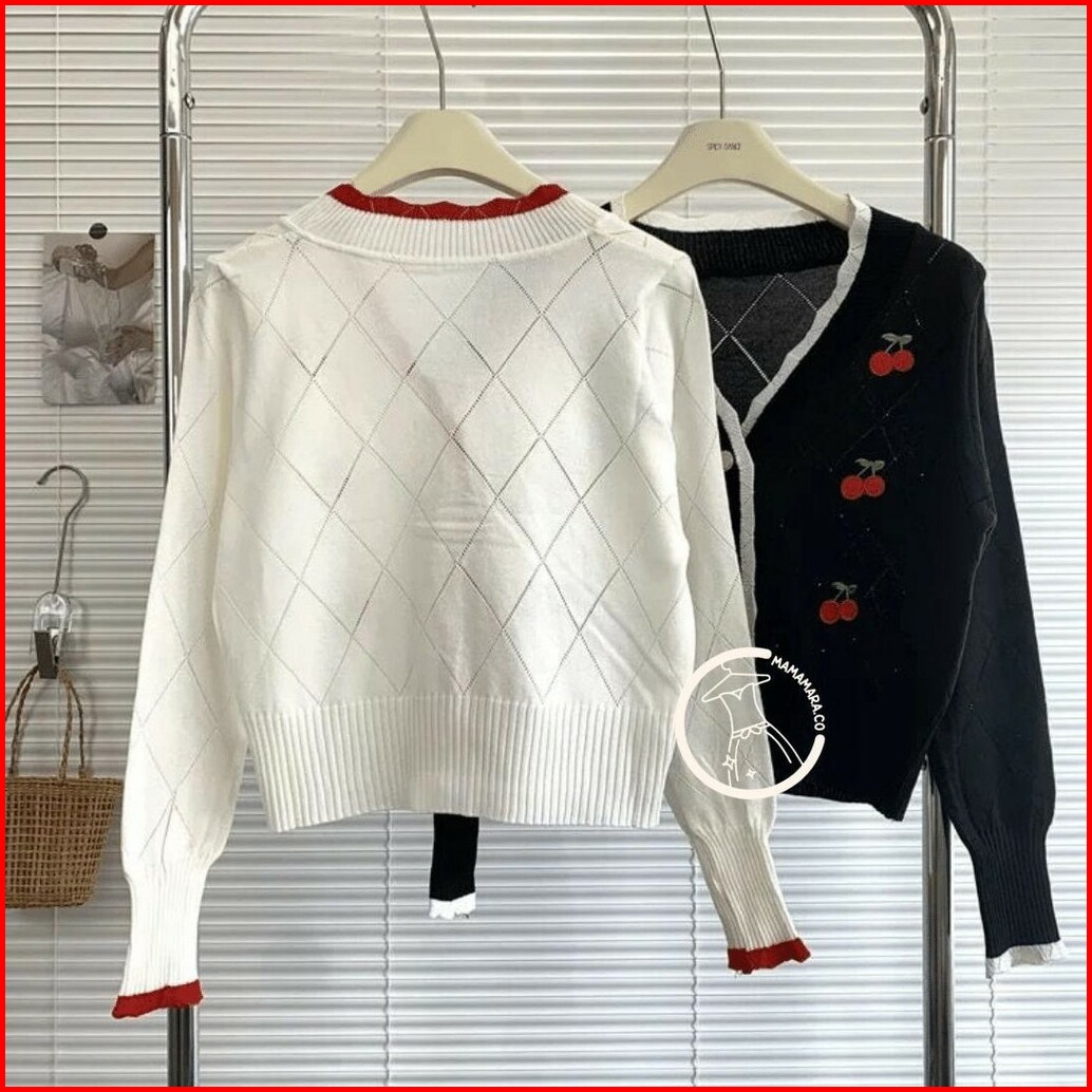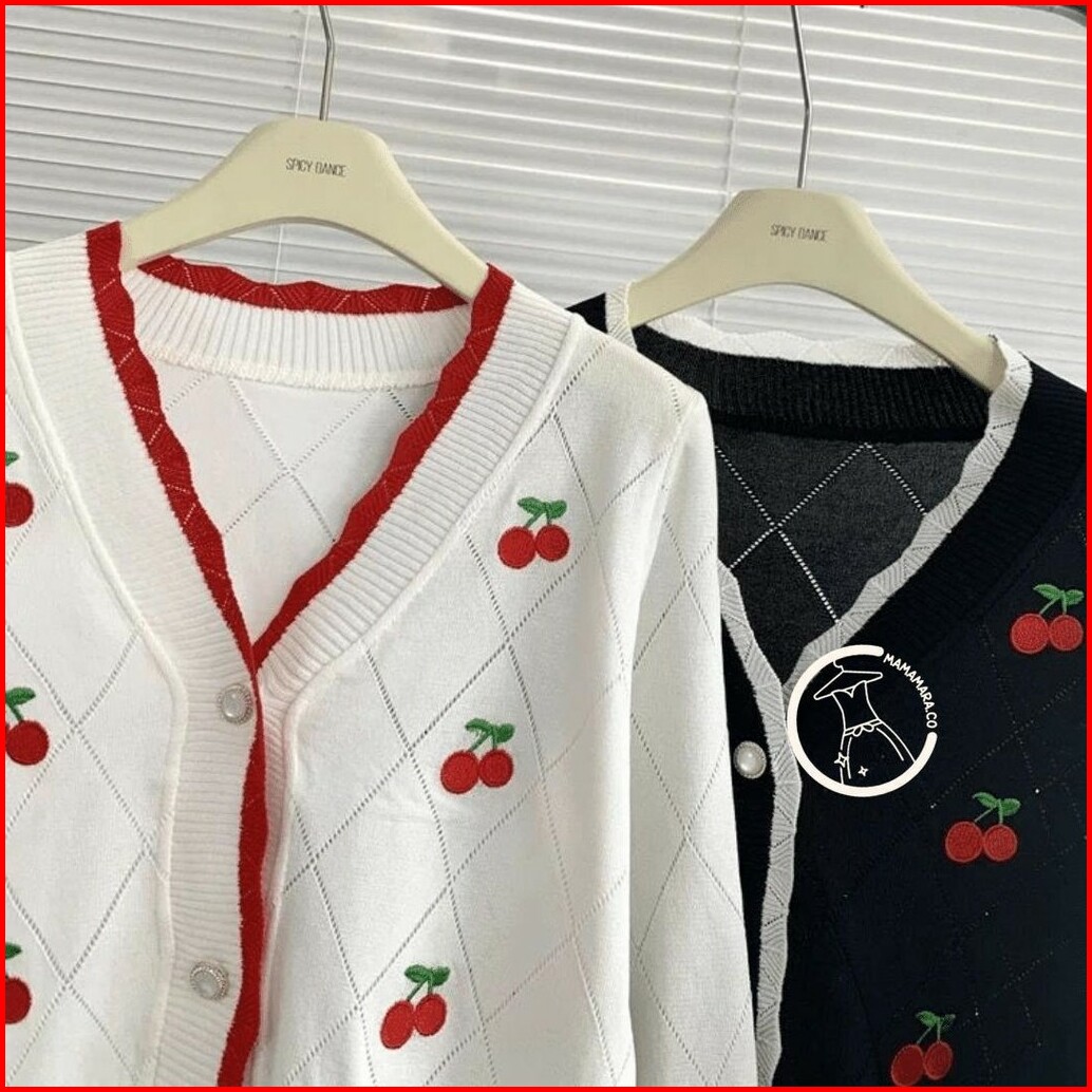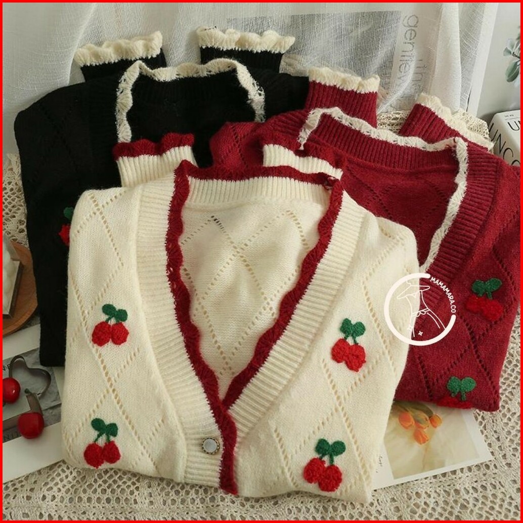 Mamamara - Sweater Cherry 3d Rajut Wol Santai Cardigan Atasan Oversize Wanita Vintage Knitwear Top Panjang Baju Wanita V