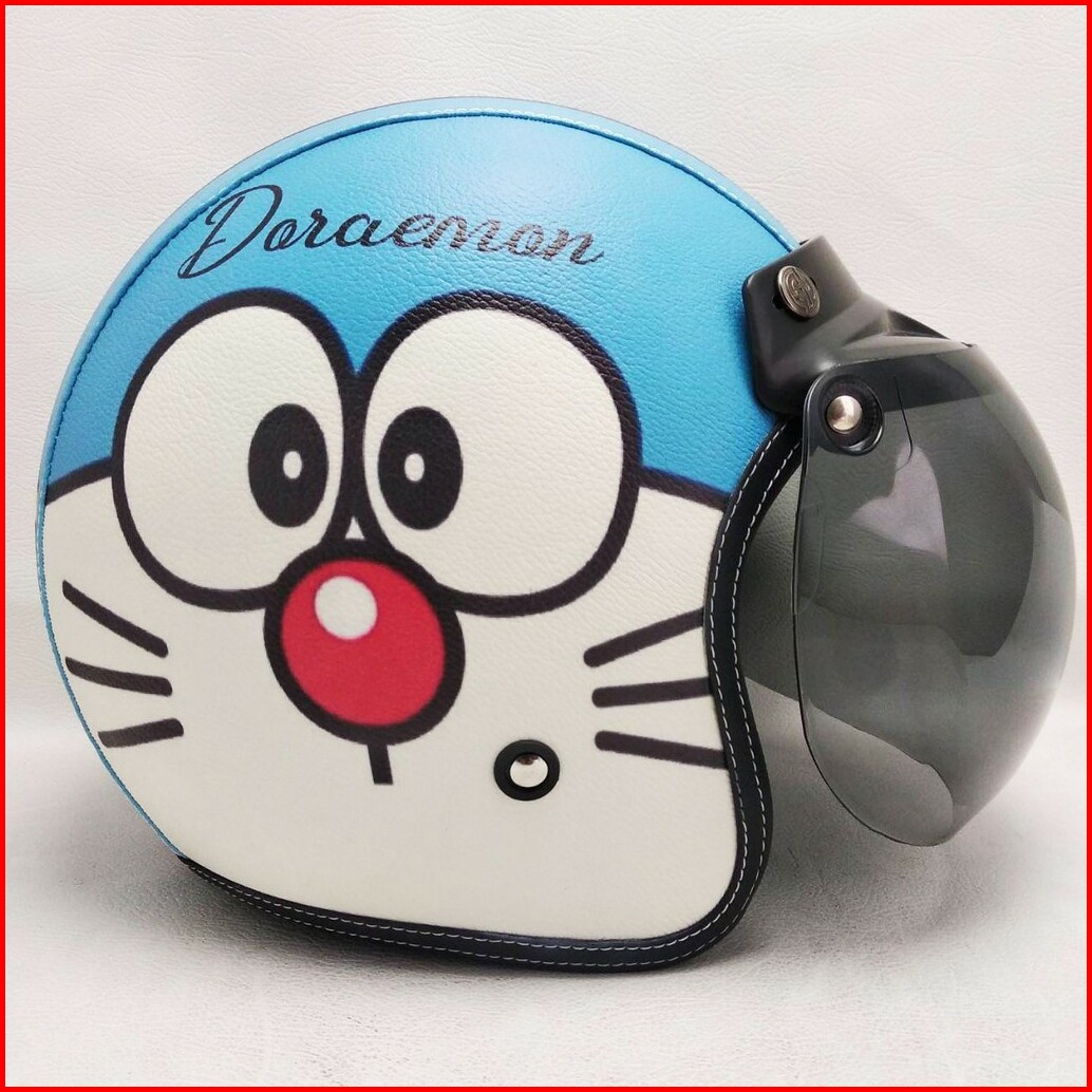 Helm Bogo Retro Kulit Motif Doraemon Bell Kaca Bubble Halfface Helmet
