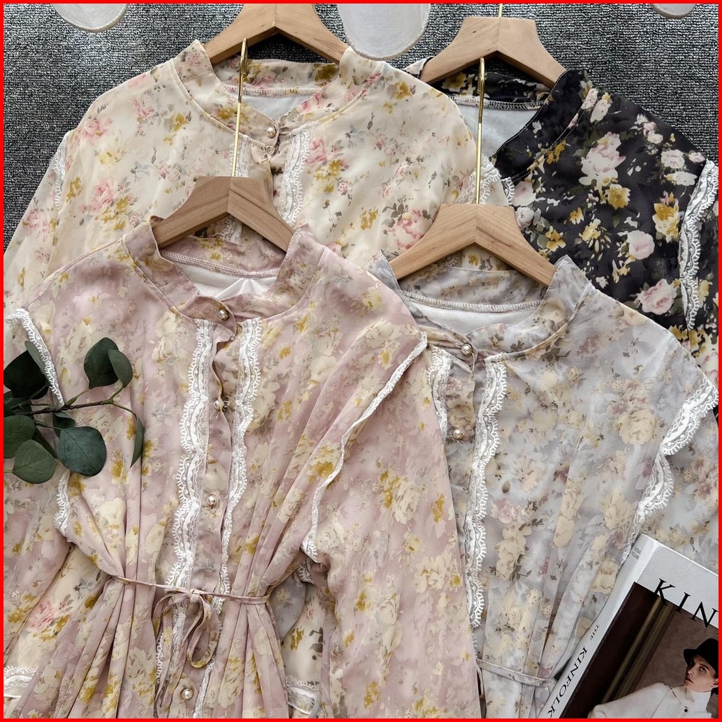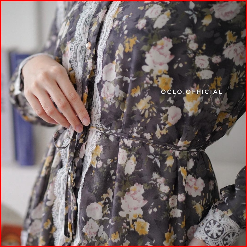 Oclo Vindara Midi Dress 304-115-7 Pakaian Wanita Vintage Loose Outfit Flower List Renda Ceruty