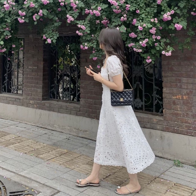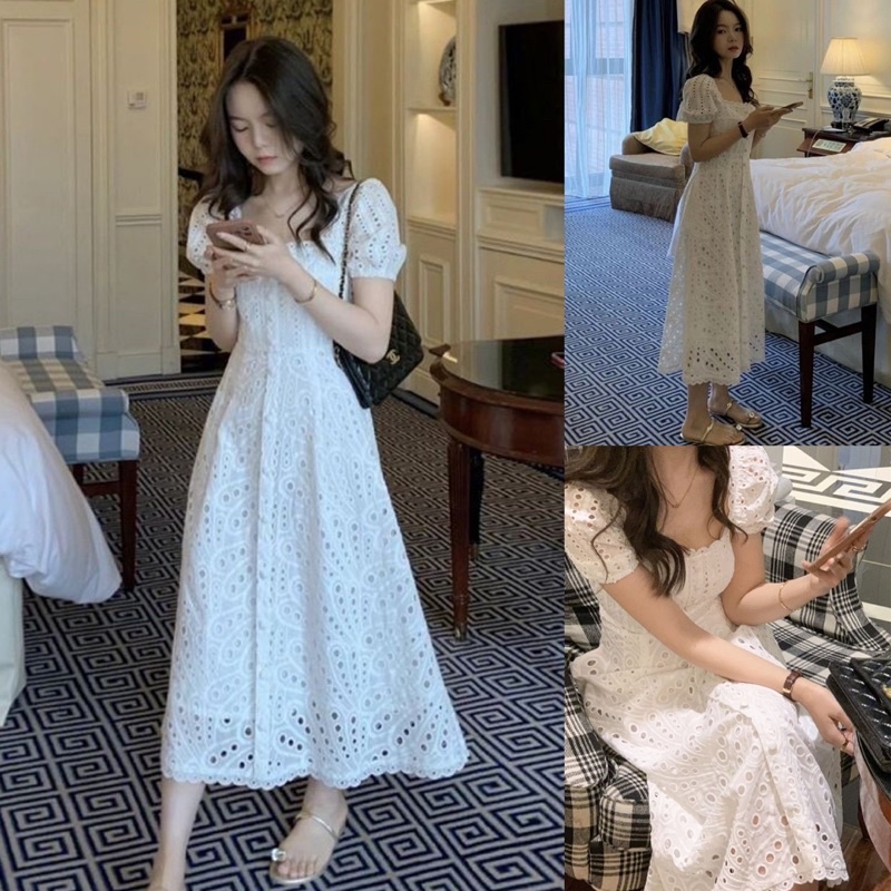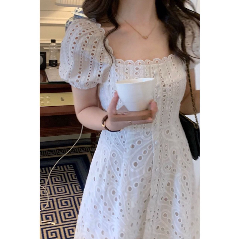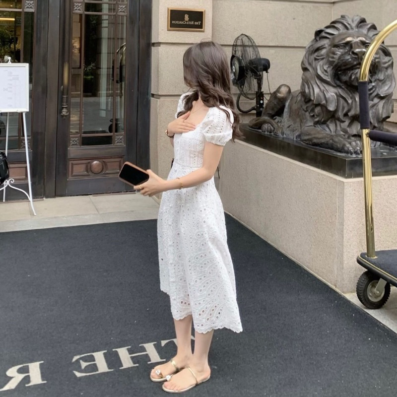 Dress Korean Style Vintage Midi Dres Putih Polos Katbol Katun Bolong Summer Estetik Kekinian