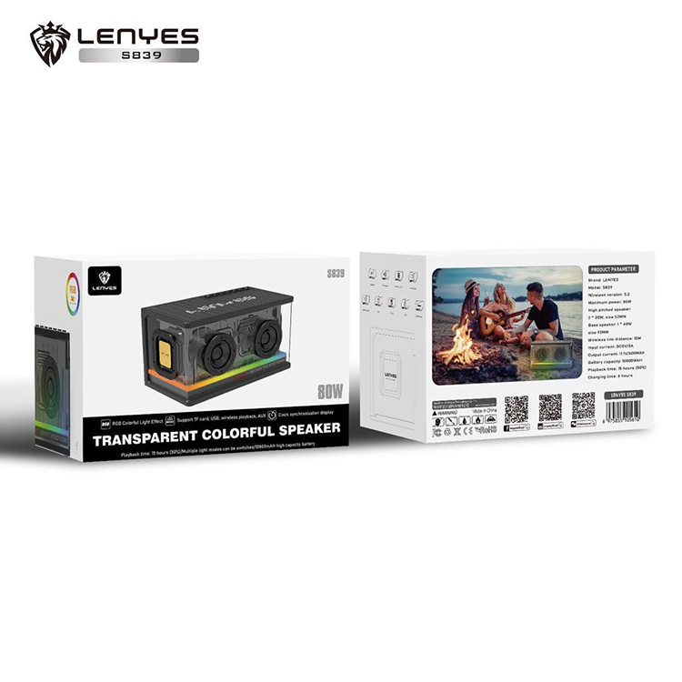 Lenyes S839 Speaker Bluetooth Transparan RGB Colorfull LED Light TWS V5.2 80W Powerfull Bass Hifi Stereo