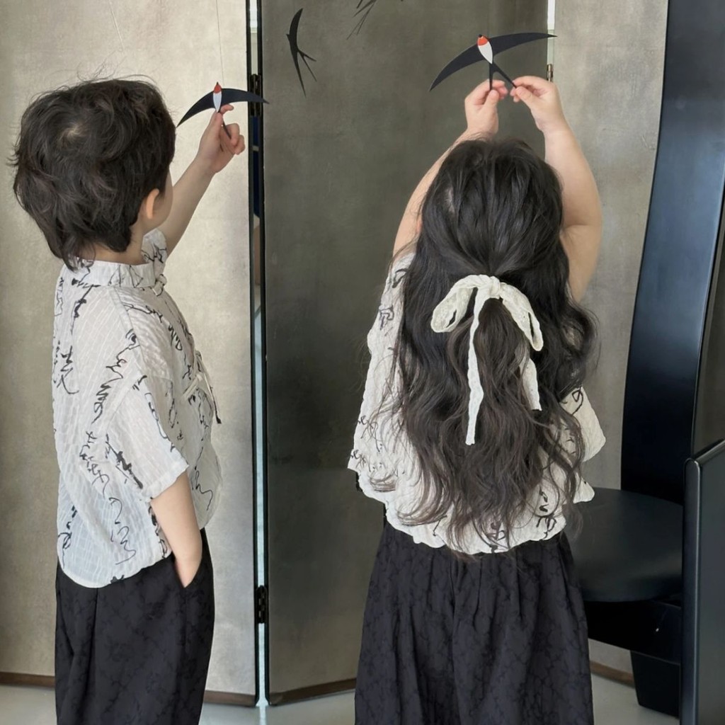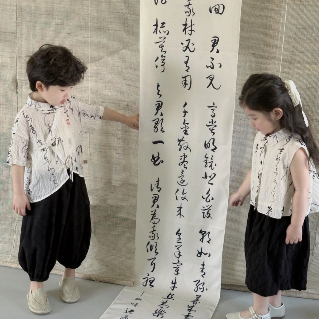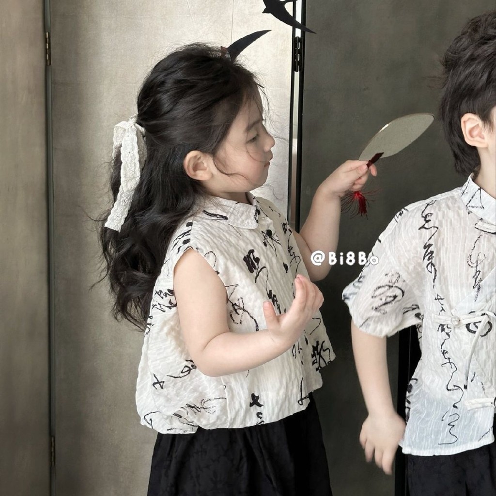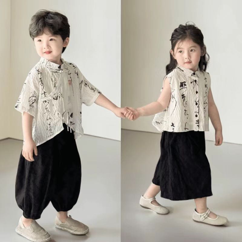 Setelan gaya untuk anak laki-laki dan perempuan kemeja anak, kemeja lengan pendek gaya Tionghoa musim panas setelan kem
