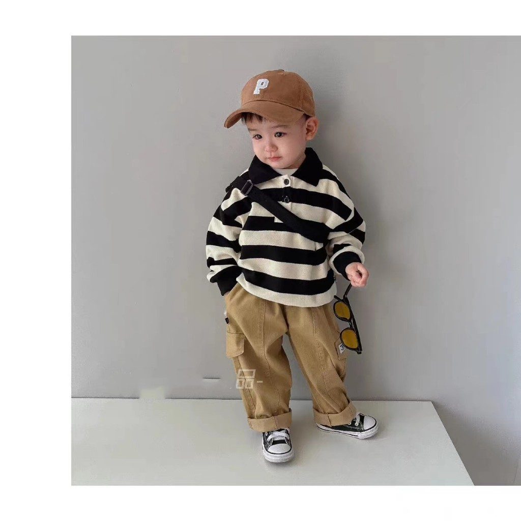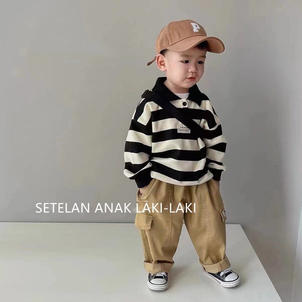 MAKABAKA Korean Style Setelan Anak Laki-Laki Atasan Garis-Garis Lengan Panjang Kemeja+Celana Cargo Setelan Anak Laki-lak
