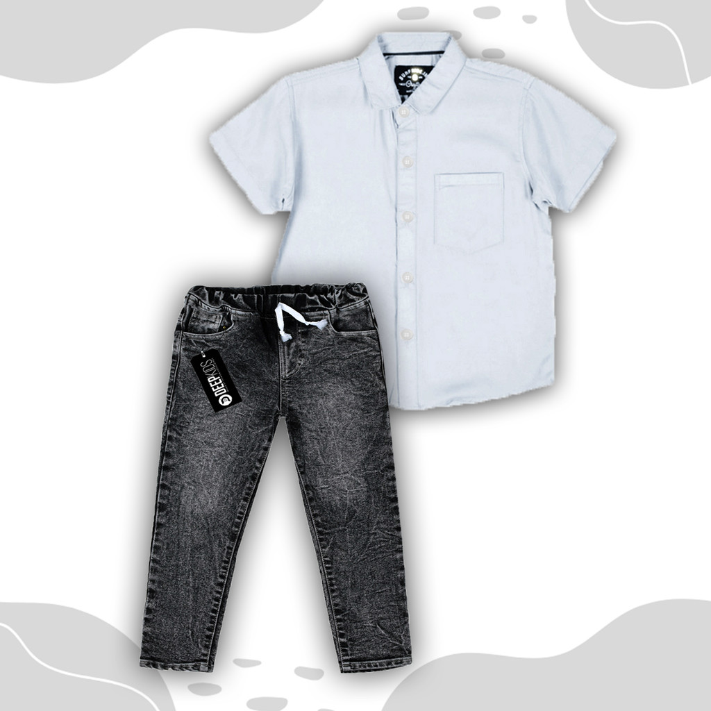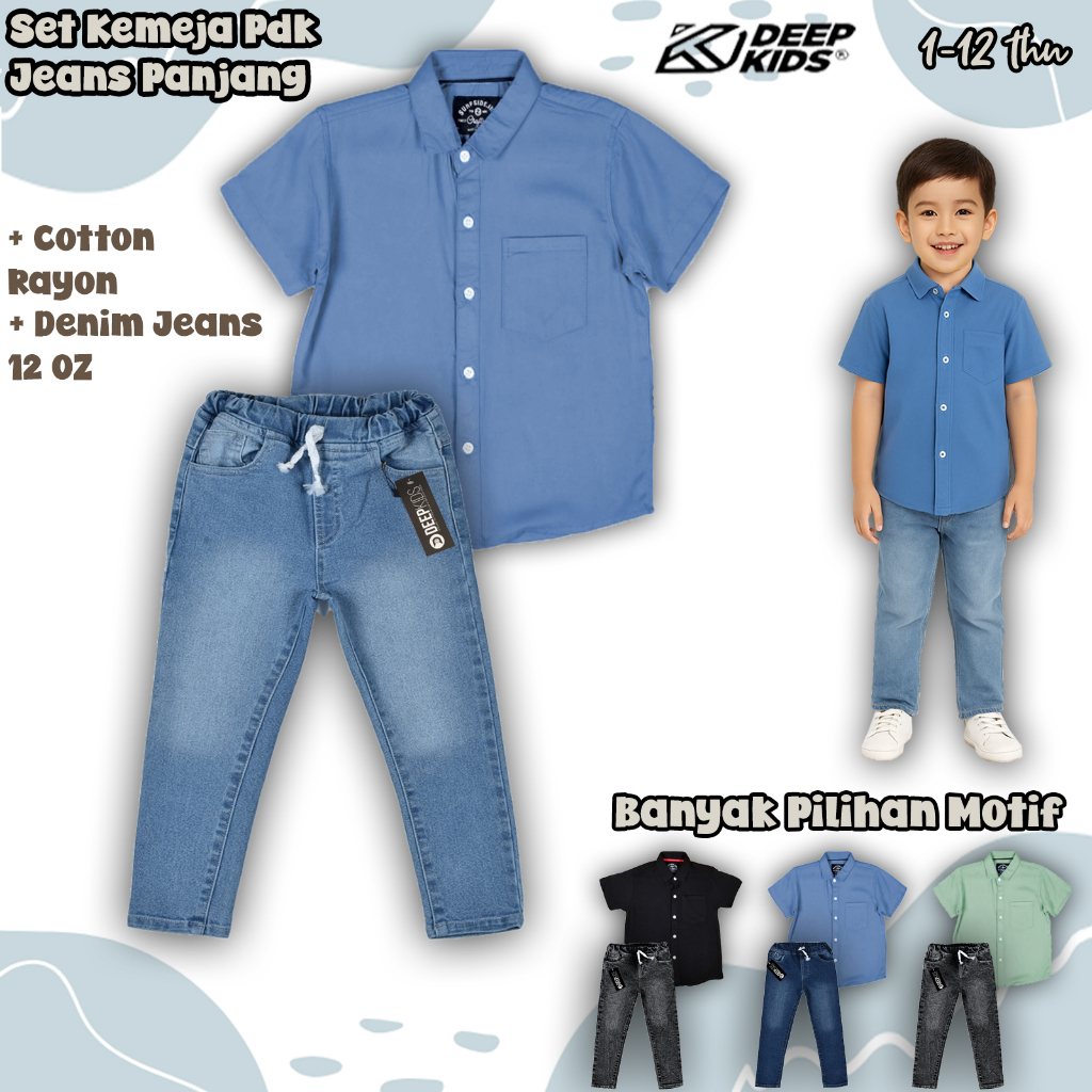 Deepkids Setelan Anak Laki Laki Kemeja Pendek Celana Jeans Panjang Premium Usia 1 2 3 4 5 6 7 8 9 10 11 12 Tahun | Set