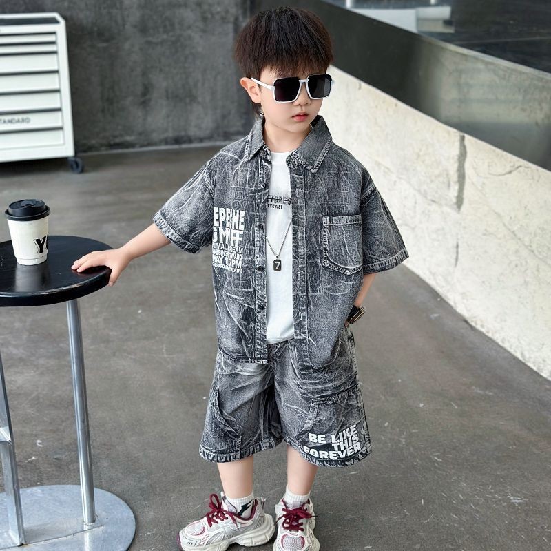 Set Dua Potong Kemeja Lengan Pendek Pola Gradasi Gaya Korea untuk Anak Laki-Laki, Celana Pendek Cargo Santai yang Trendy