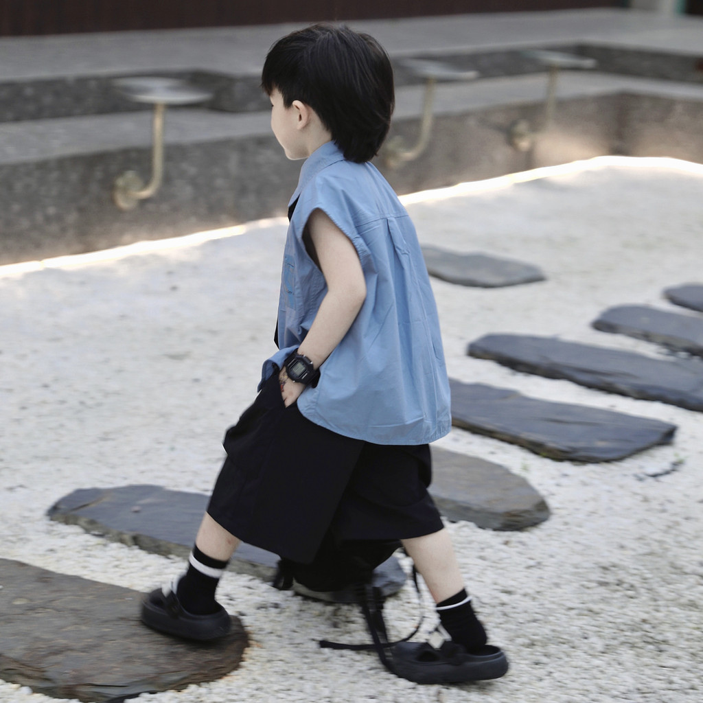 Setelan Baju Anak Laki-laki Dua Potong, Kemeja Tanpa Lengan Saku Biru Longgar Kasual Celana Pendek