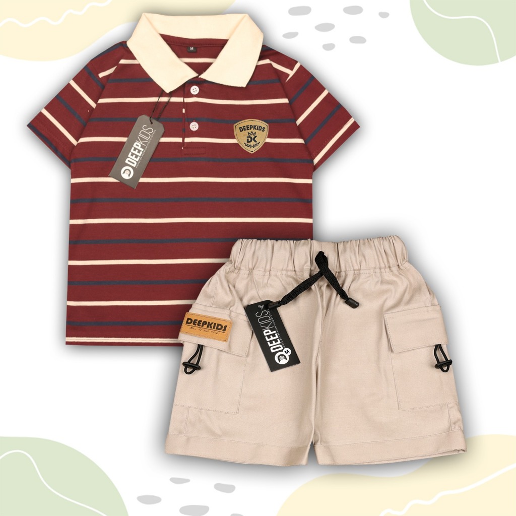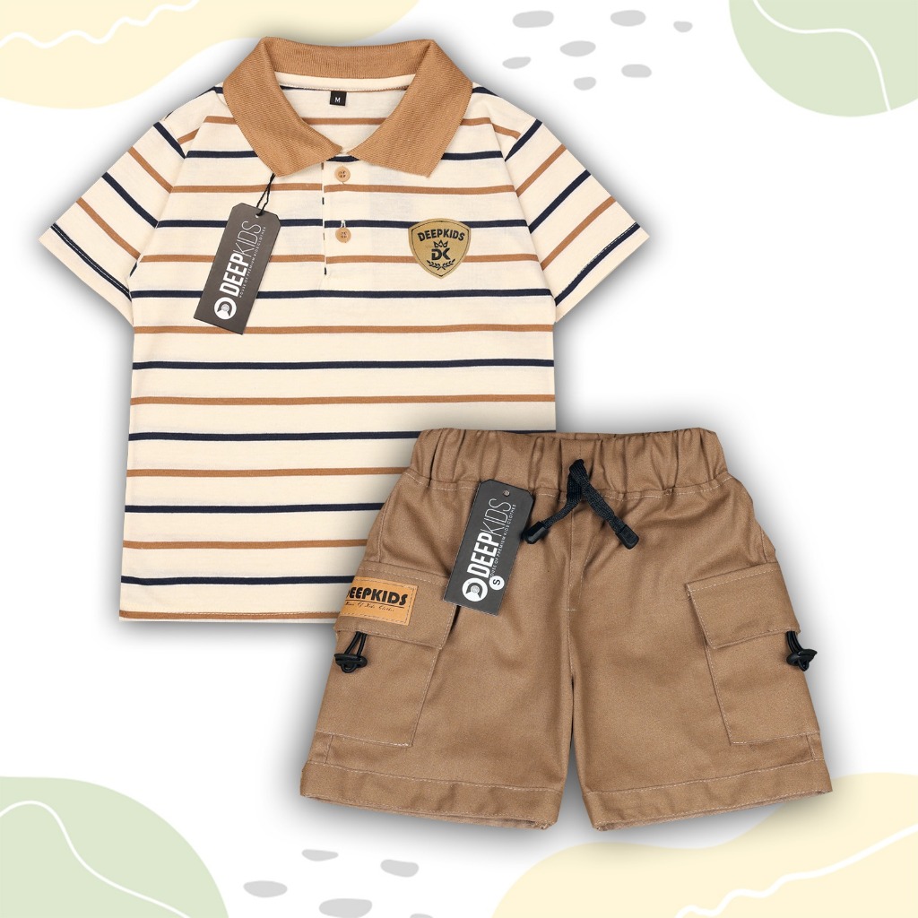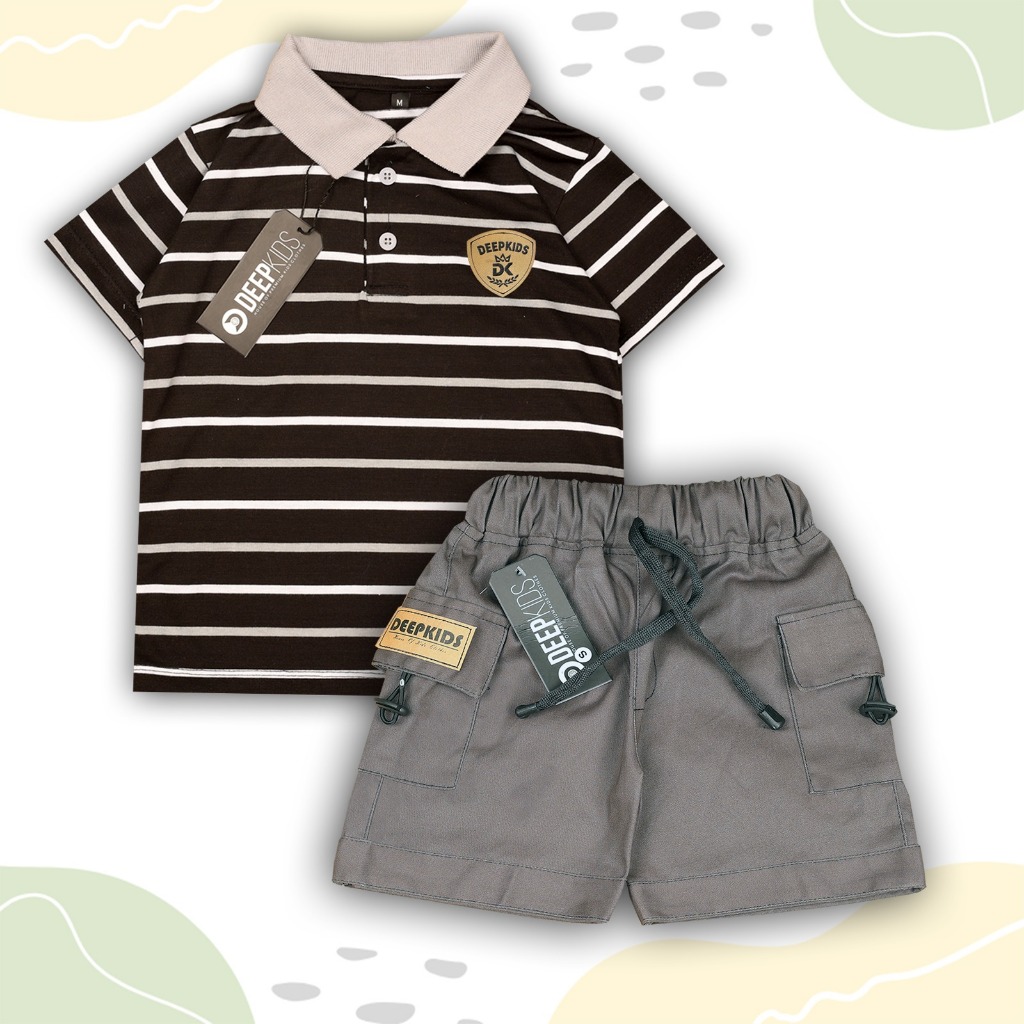 DEEPKIDS Setelan Anak Laki Laki Baju Kaos Kerah Salur & Celana Cargo Pendek Bahan Cotton CVC 24s & Cotton Twill Premium