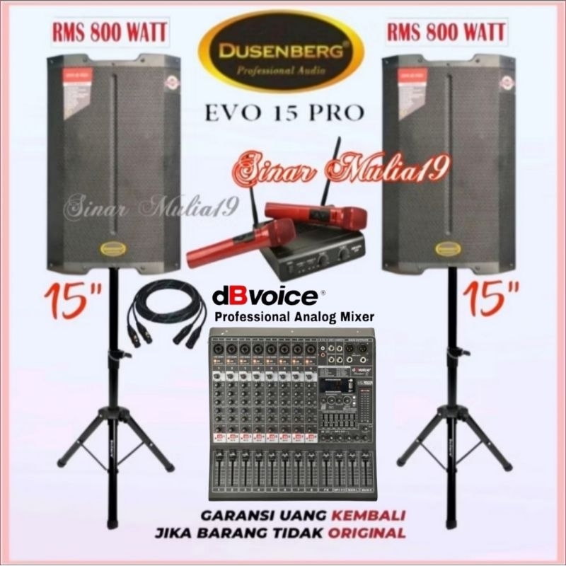 Paket Sound System Speaker Aktif 15 Inch Dusenberg EVO 15 PRO Mixer 10 Ch dBvoice Champion-10 Mic Wireless Ashley Original