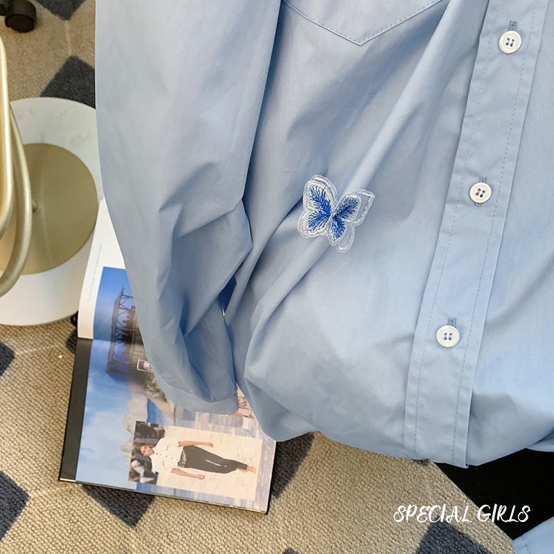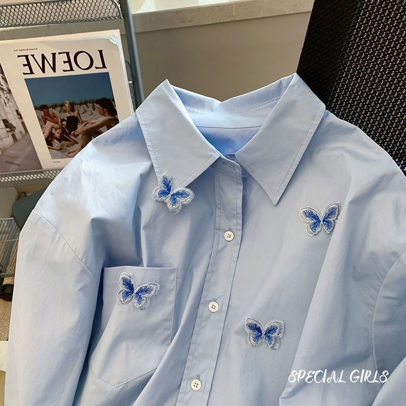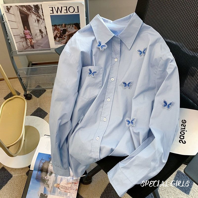 Kemeja dengan desain tiga dimensi retro, atasan berlengan panjang longgar, kemeja serbaguna dengan pesona elegan