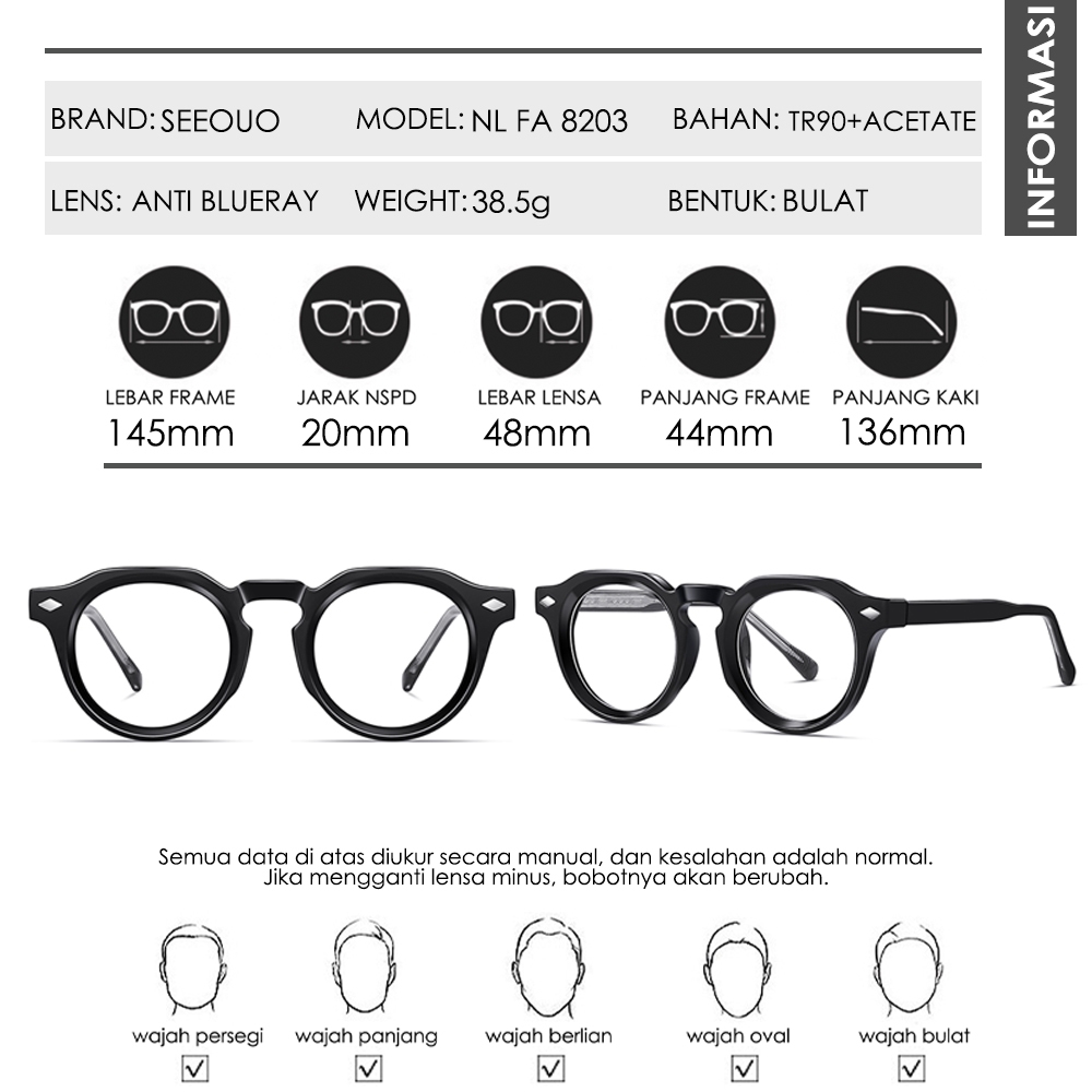 Seeouo Kacamata Antiradiasi Blueray Style Bulat TR90+Acetate Vintage Fashion Style Frame Pria Wanita Bisa Minus Photocromic Bluecromic 8203