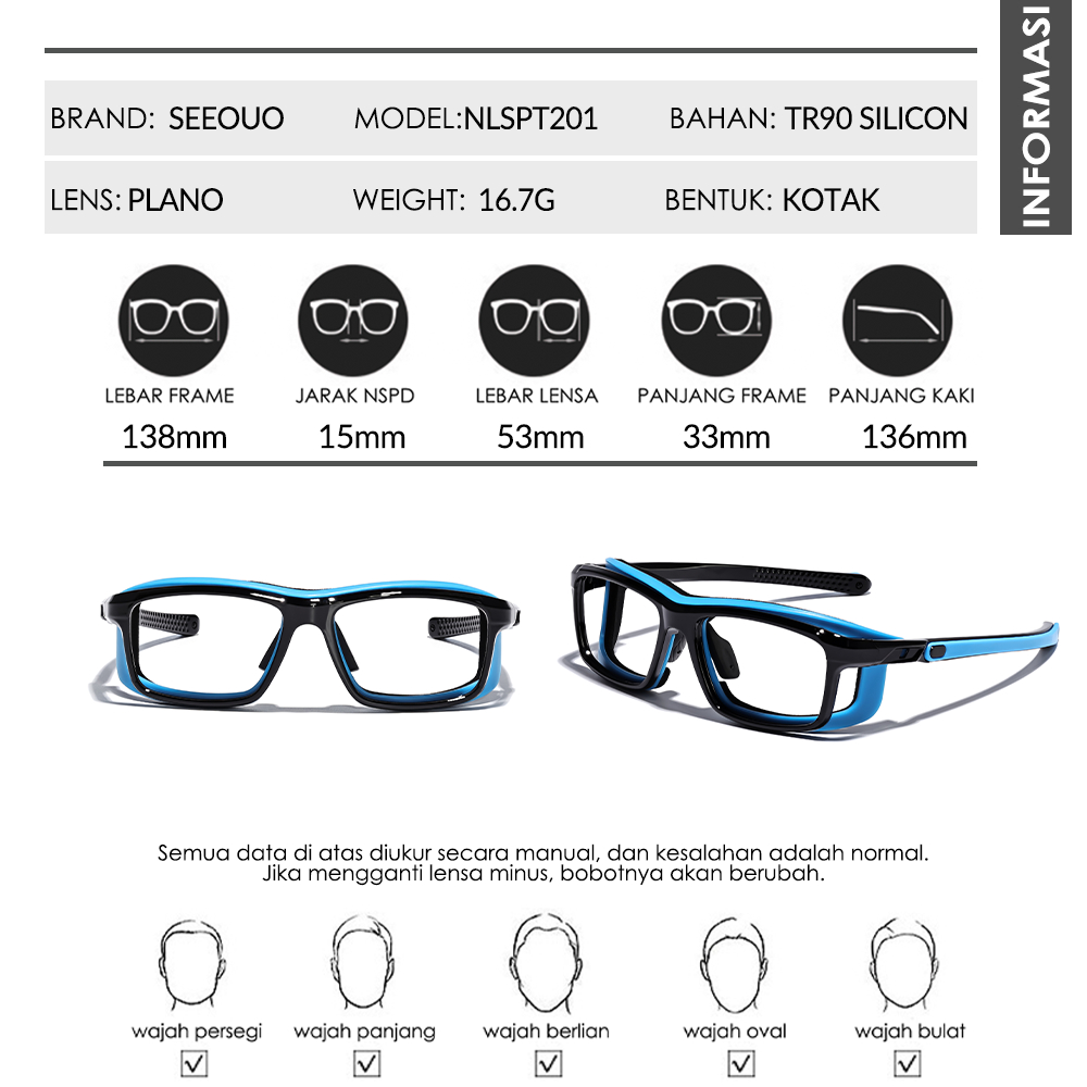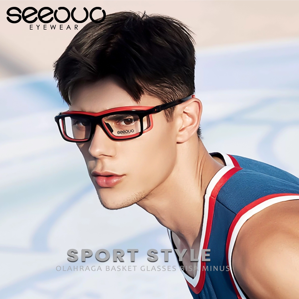 Seeouo Kacamata Frame Sport Style Model Kotak TR90+Silicone Strap Olahraga Simple Badminton, Bersepeda Lari Bisa Minus Photocromic Antiradiasi 201