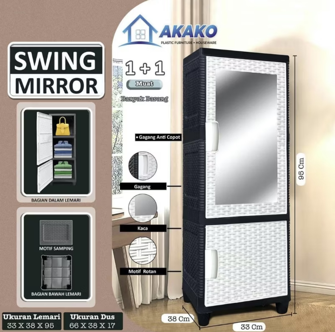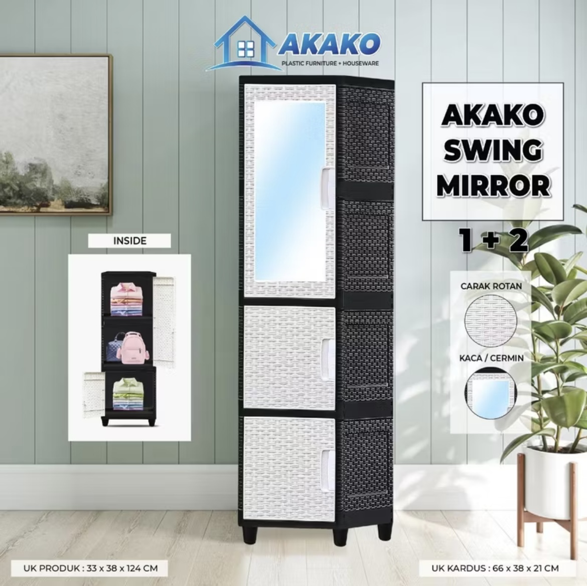 LEMARI PAKAIN PLASTIK MINUMALIS MODERN - AKAKO 1 PINTU FULL RAK + KACA SWING MIROR BERKUALITAS