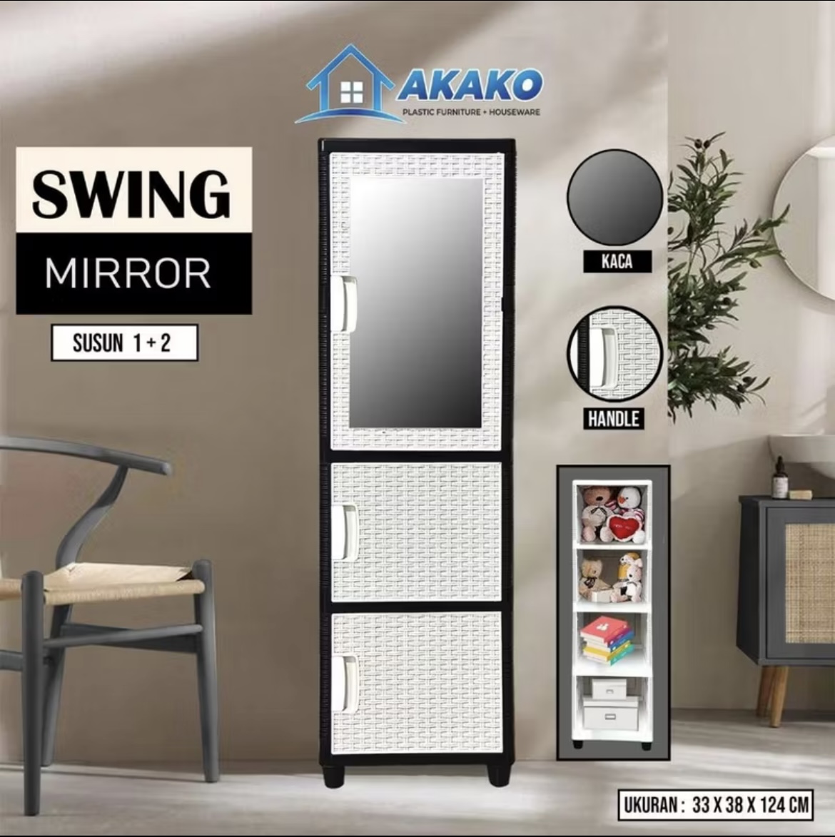 LEMARI PAKAIAN PLASTIK MINIMALIS MODERN - AKAKO 1 PINTU FULL RAK + KACA SWING MIROR BERKUALITAS