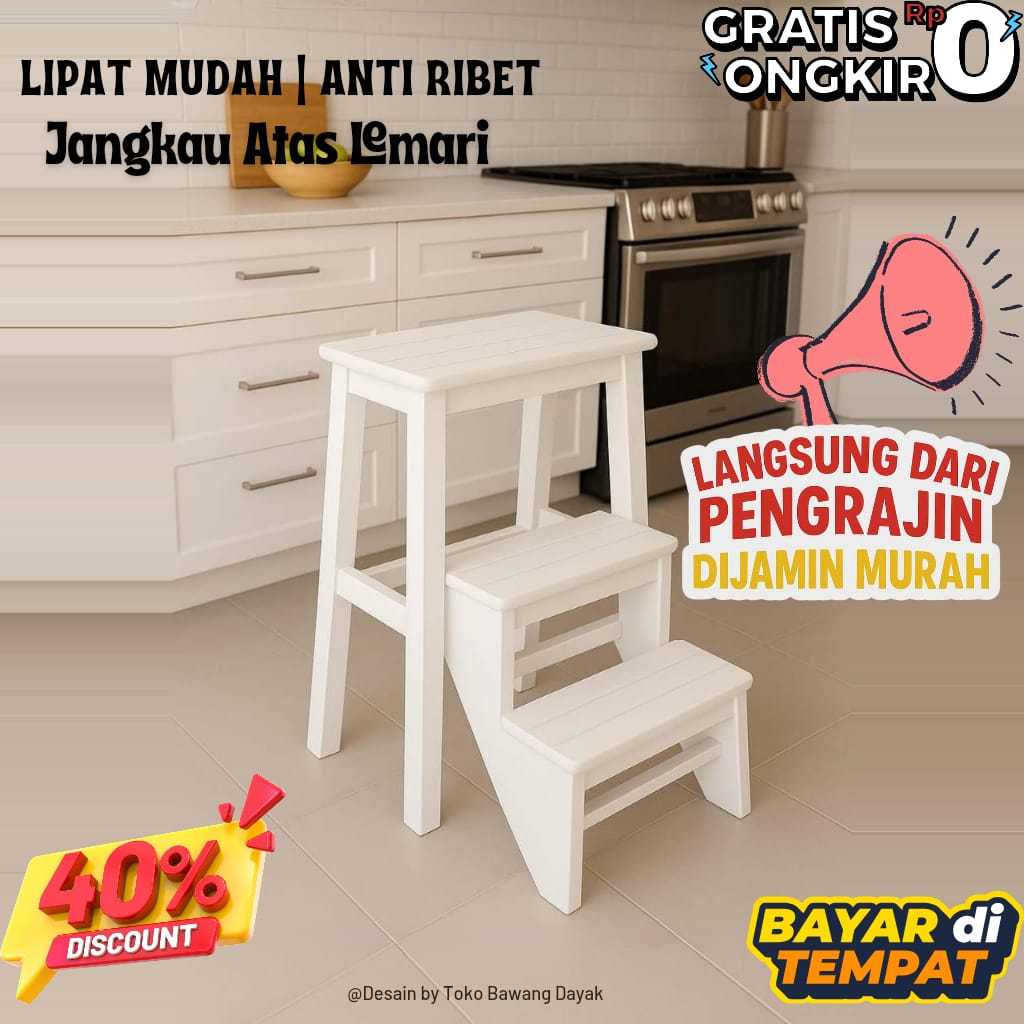 Kursi Tangga Lipat Kayu Jati Warna Putih – 3 Anak Tangga, Multifungsi 2in1, Minimalis Estetik