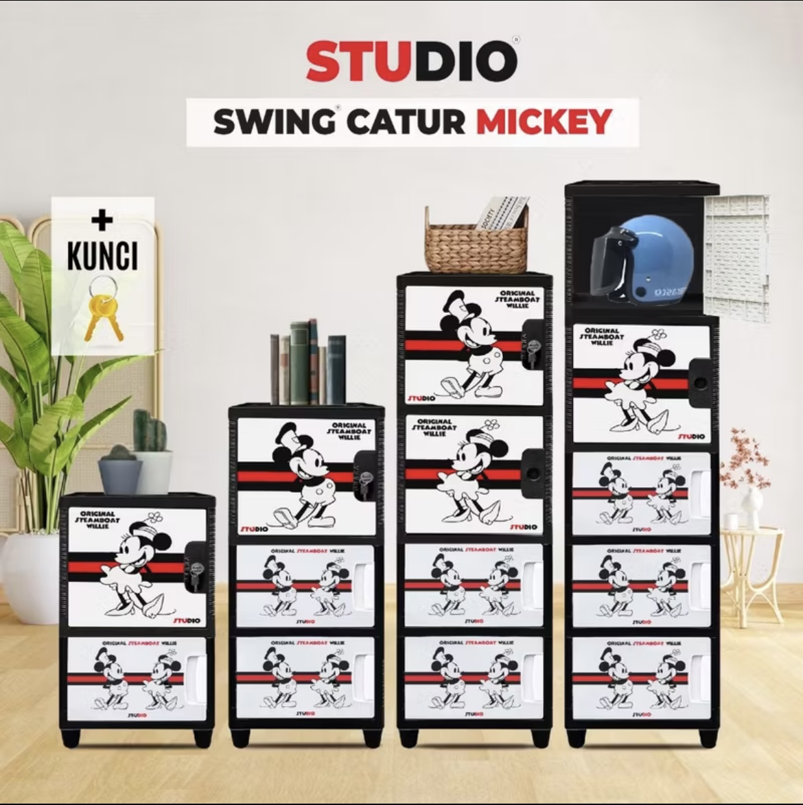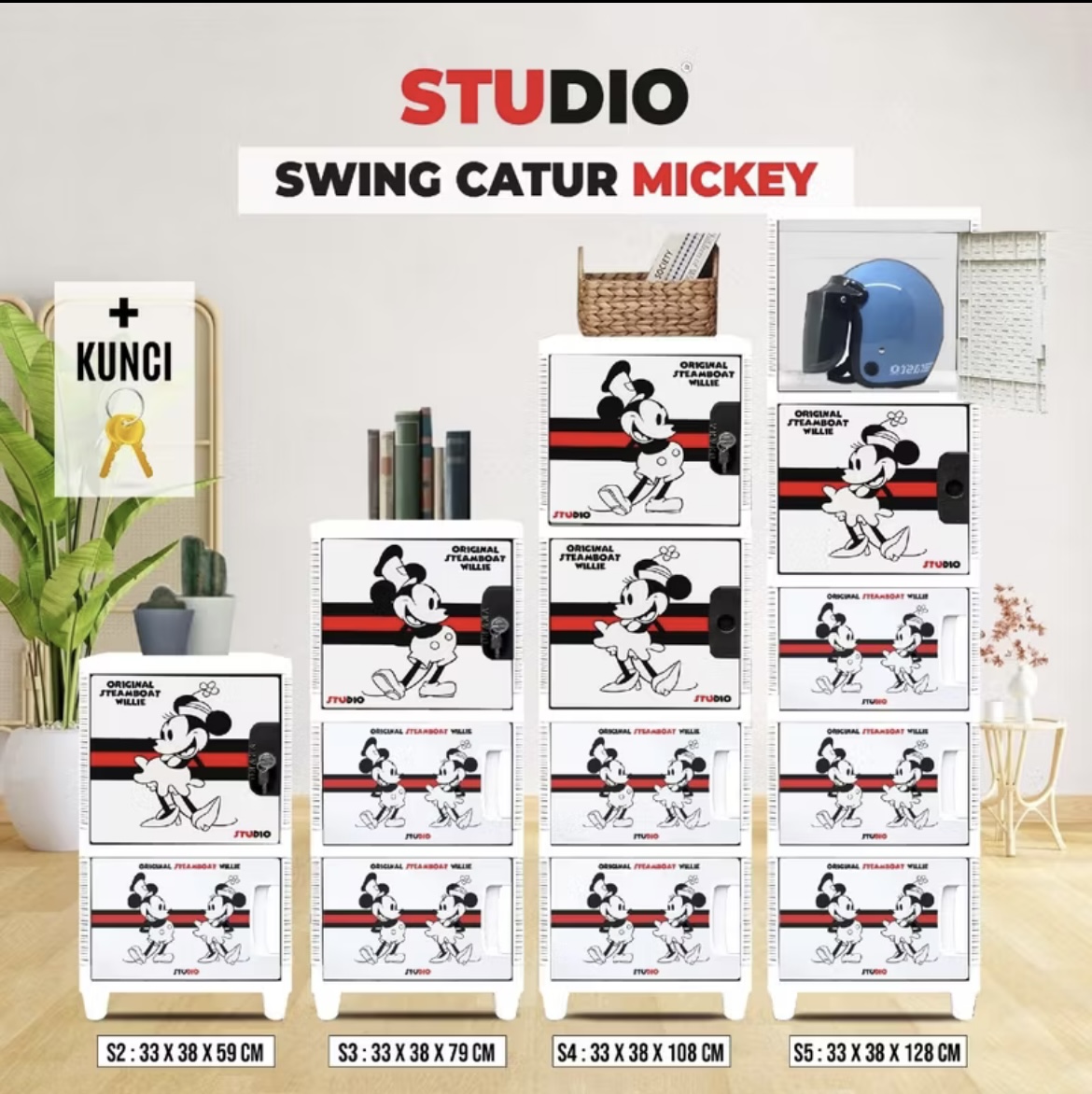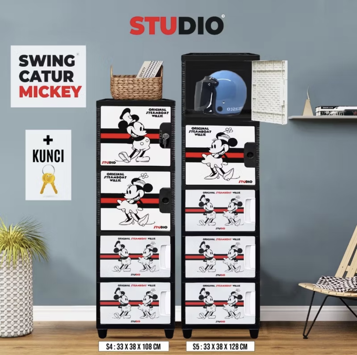 STUDIO - LEMARI PAKAIAN PLASTIK JUMBO SWING MICKEY MOUSE 1 PINTU + KUNCI PRINTING SUSUN 2, 3, 4 & 5