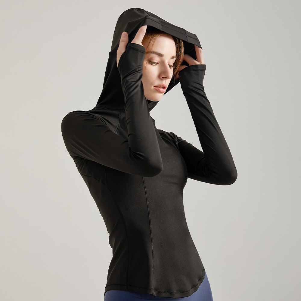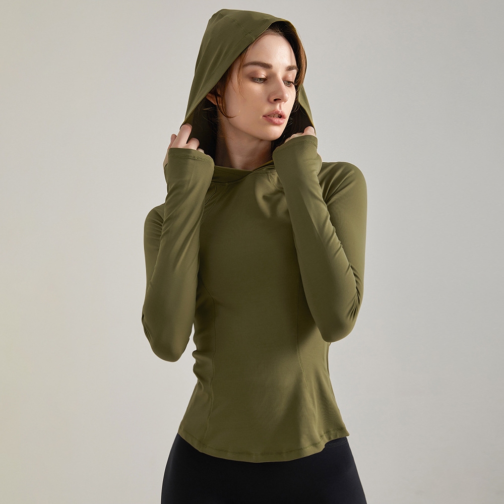 AKLOVER Pakaian Yoga Berkerudung Atasan Lengan Panjang Lari Wanita Slim Fit Bernapas Cepat Kering