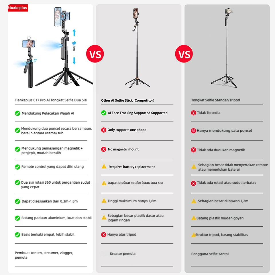 Tiankeplus AI Auto Face Tracking Tripod Konten Kreator 2in1 Tongsis MagSafe + Clamp Dual Phone AI Smart Selfie Stick Gesture Control 1.8M Aluminium Selfie Stick HP C17 Pro