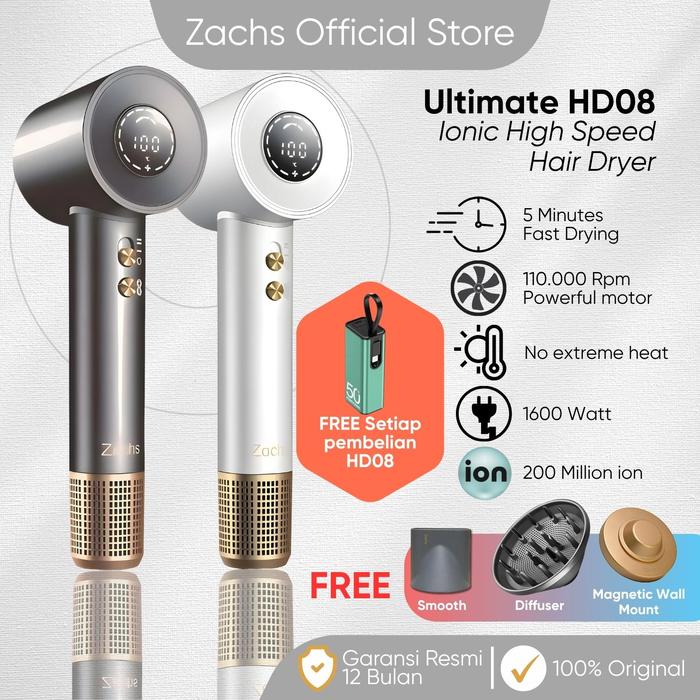 Zachs Ultimate HD08 Pengering Rambut Ion Profesional High Speed Silent dan Ringan 1600W 59db Tidak