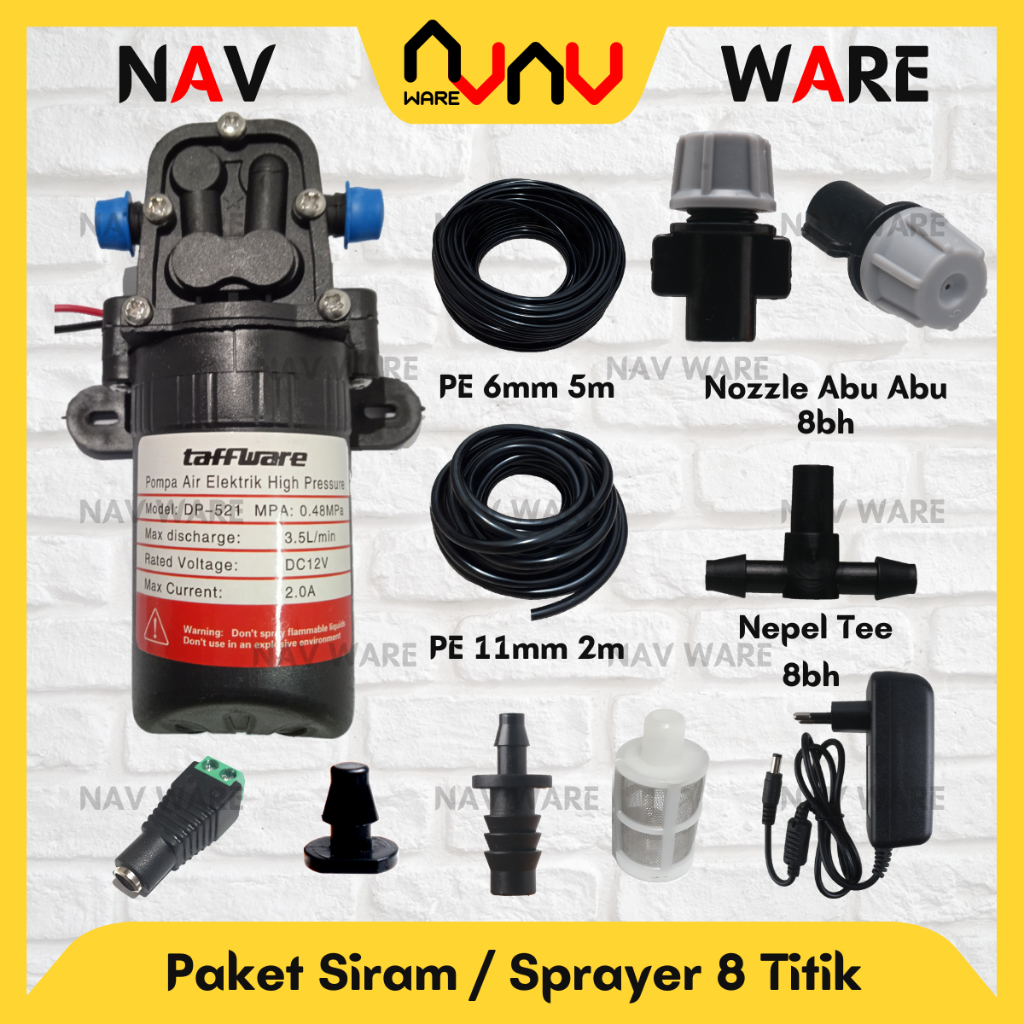 Paket Sprayer Siram Tanaman 8 / 10 Titik Pompa DC 12V - Nozzle Orange / Abu - Alat Siram Kabut Kebun Hidroponik Pertania