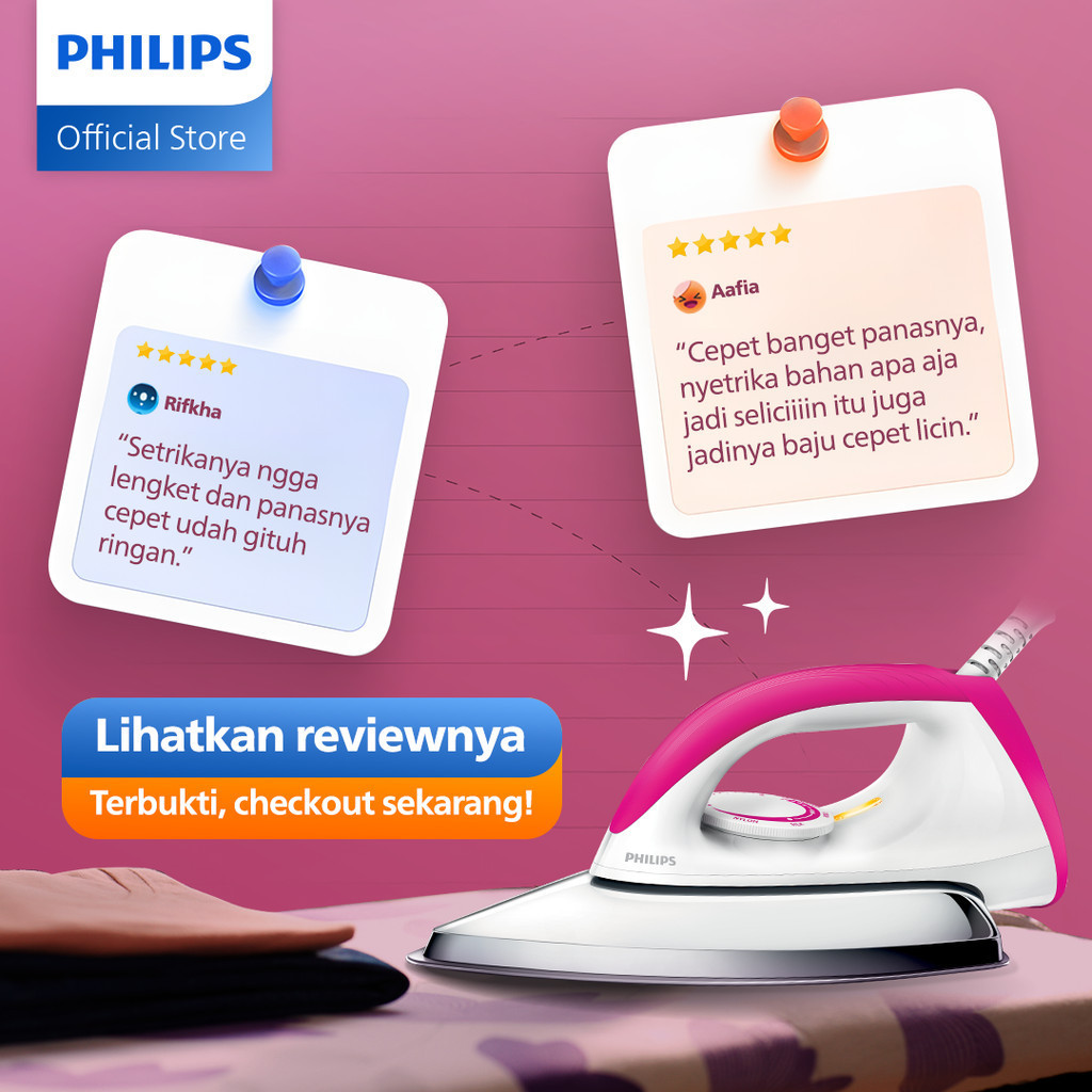Philips Setrika kering HD1173/40 Pink, Ceramic 4 Lapis, Anti-Lengket, seterika philips, gosokan baju