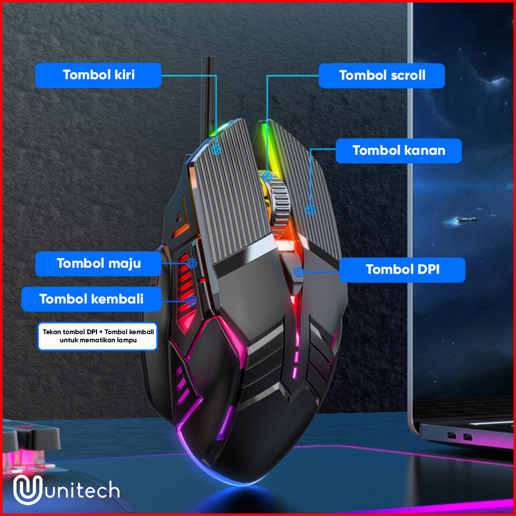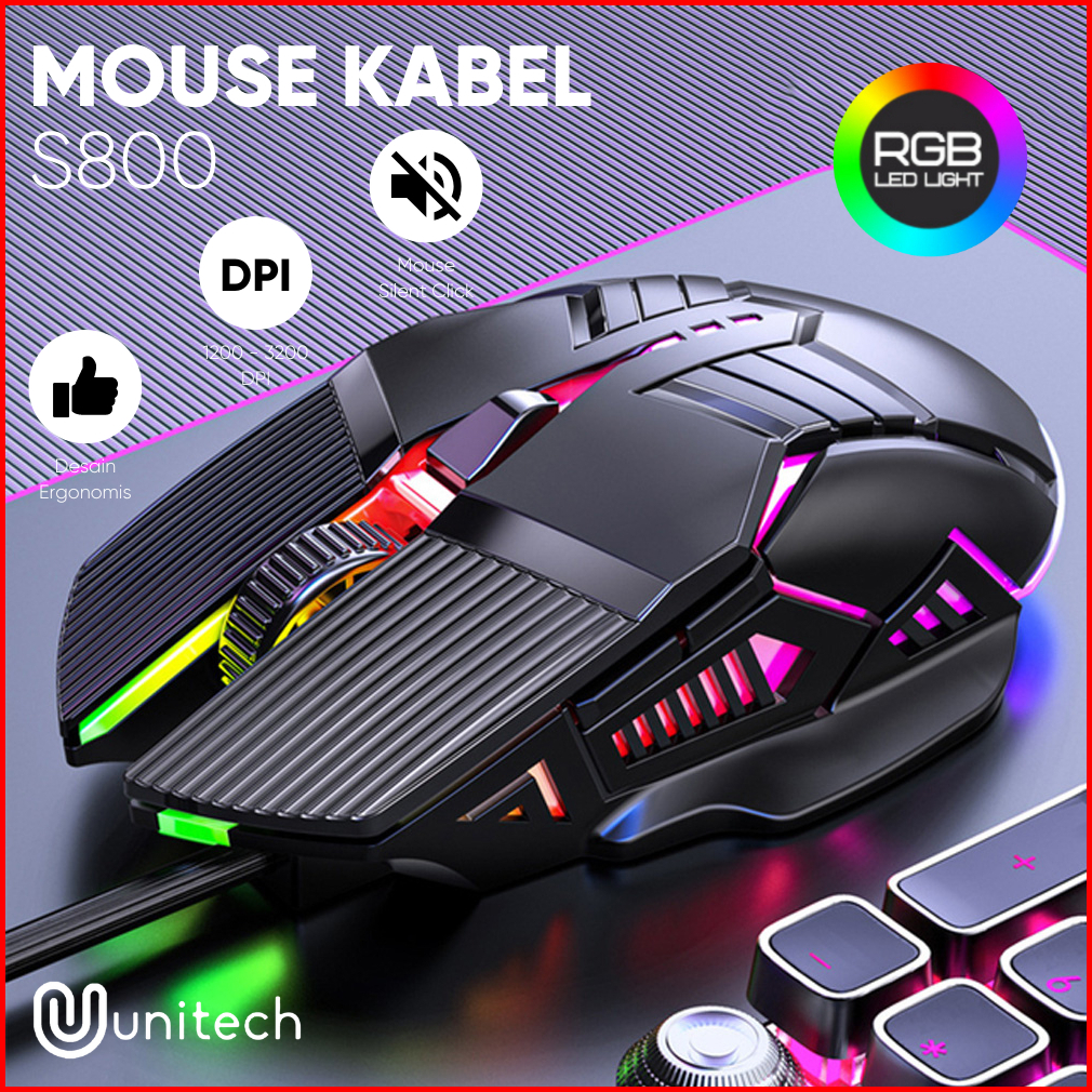 Mouse Gaming Kabel Optical Unitech Colorful Backlight Silent Click Mode 3200 Dpi S800