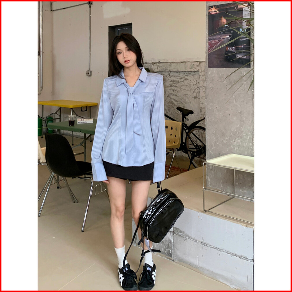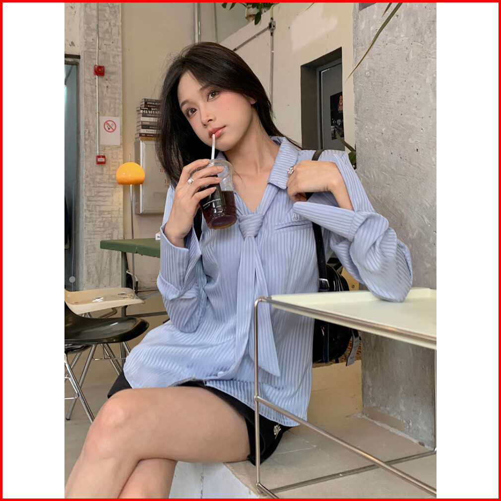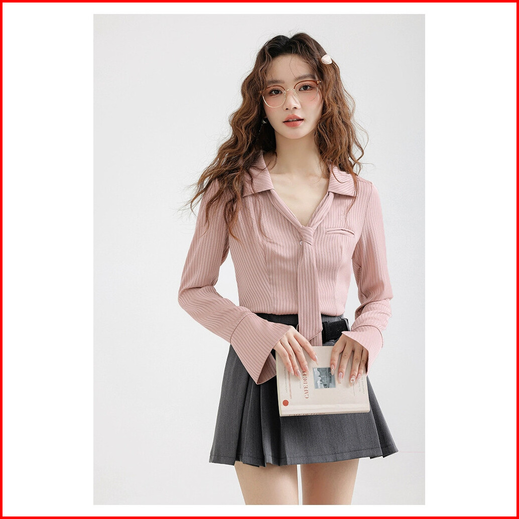 Meet.u Blus Sifon Wanita Bordir V Neck Lengan Panjang Ekstra Kemeja Garis Wanita