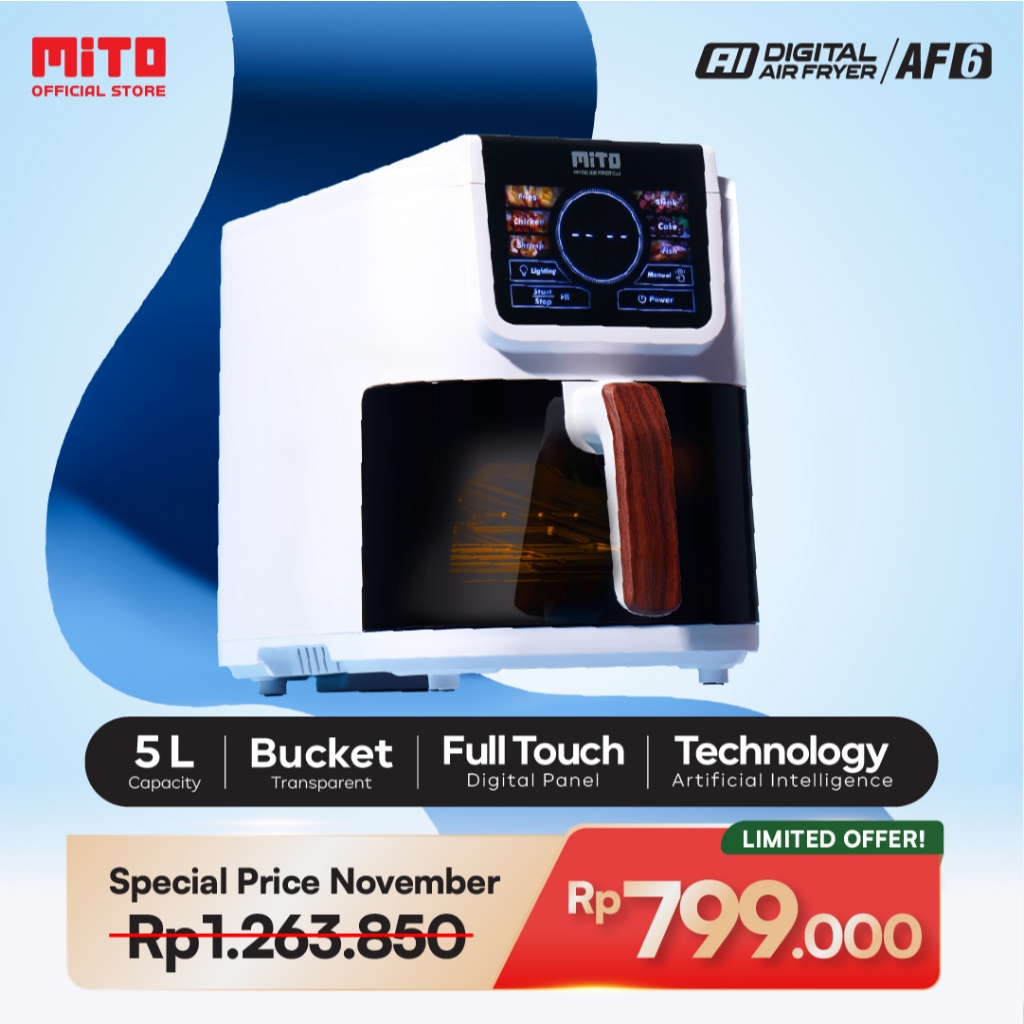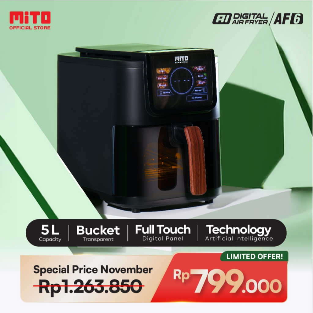 MITO Air Fryer AF6 Smart AI-Fryer Digital, Low Watt, 5L Semi Transparan, Touch Screen LED